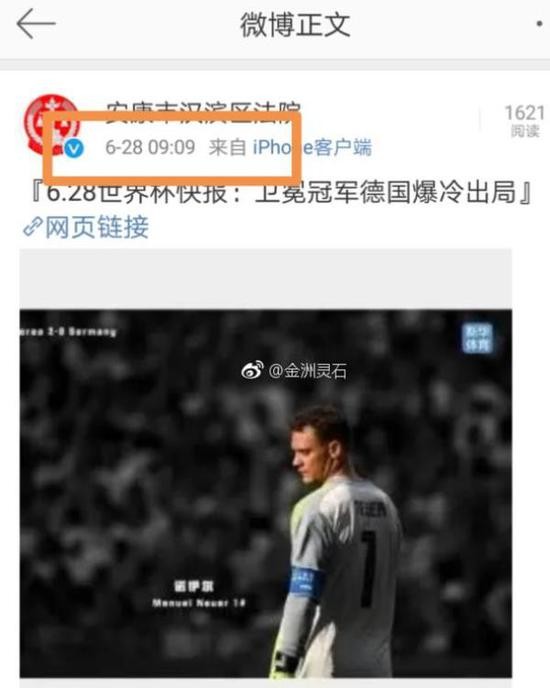 陕西省安康市汉滨区人民法院的官方微博从6月下旬开始,每天都发布世界杯。 截屏图 近日,有网友向法制晚报·看法新闻爆料,称陕西省安康市汉滨区人民法院的官方微博从6月下旬开始,每天都发布世界杯的消息,不仅有当天的比赛预告,还有前一天比赛的结果。爆料者认为,该院的官微每天都发布与工作无关的内容,属于不务正业。 法制晚报·看法新闻记者浏览汉滨区法院的官方微博,发现有多条世界杯的相关内容,包括“速报D组克罗地亚队阿根廷队出线”、“四场小组赛今晚明晨继续举行”、“世界杯16强对阵表!你看好谁”等内容。其中更有一条内容为“6.28世界杯快报:卫冕冠军德国队爆冷出局”的微博,发布时间为“6月28日09:09分”,恰好是正常工作日的上班时间。