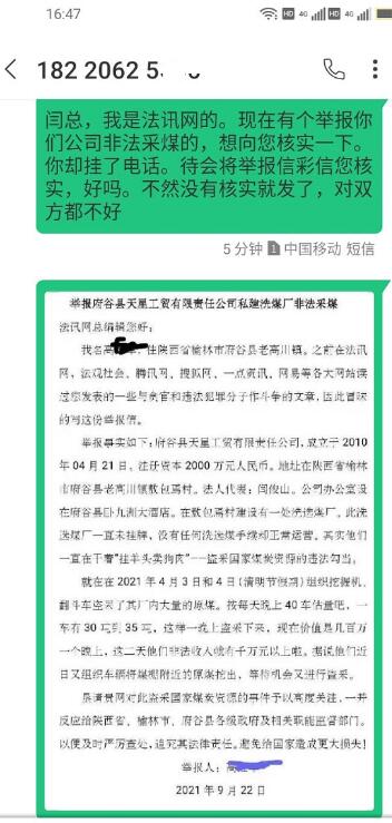 | 举报府谷县天星工贸有限责任公司私建洗煤厂非法采煤 法讯网总编辑您好: 我名高红军,住陕西省榆林市府谷县老高川镇。之前在法讯网,法观社会、腾讯网、搜狐网、一点资讯、网易等各大网站读过您发表的一些与贪官和违法犯罪分子作斗争的文章,因此冒昧的写这份举报信。 举报事实如下:府谷县天星工贸有限责任公司,成立于2010年04月21日。注册资本2000万元人民币。地址在陕西省榆林市府谷县老高川镇敖包焉村。法人代表:闫俊山。公司办公室设在府谷县卧九洲大酒店。在敖包焉村建设有一处洗选煤厂。此洗选煤厂一直未挂牌,没有任何洗选煤手续却正常运营。其实他们一直在干着“挂羊头卖狗肉”——盗采国家煤炭资源的违法勾当。 就在在2021年4月3日和4日(清明节假期)组织挖掘机、翻斗车盗采了其厂内大量的原煤。按每天晚上40车估量吧,一车有30吨到35吨,这样一晚上盗采下来,现在价值是几百万一个晚上,这二天他们非法收入就有千万元以上啦。据说他们近日又组织车辆将煤棚附近的原煤挖出,等待机会又进行盗采。 垦请贵网对此盗采国家煤炭资源的事件予以高度关注,一并反应给陕西省、榆林市、府谷县各级政府及相关职能监督部门。以便及时严厉查处,追究其法律责任。避免给国家造成更大损失! 举报人:高红军 2021年9月22日 ![]() 隔着这约60米处就是该公司煤棚,四处都是摄像头,无法靠近拍摄 ![]() 电话及短信天星工贸公司法人闫俊山核实举报情况均未获回复 |