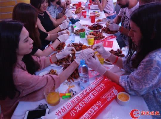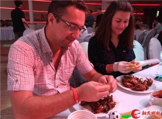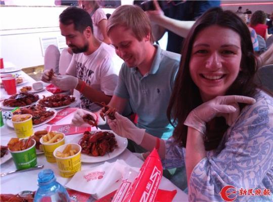 图说:此前早有报道称“中国小龙虾将亮相俄罗斯世界杯” 图TP 真是千呼万唤始出来——“10万只中国小龙虾驰援世界杯”的消息已经在网络上火了快一个月,却总是“只闻其声不见其虾”。姗姗来迟的它们,直到6月30日才抵达莫斯科的餐桌。听闻首批小龙虾上市,记者特意第一时间赶去现场体验了一把。 以世界杯为契机进军俄罗斯市场的小龙虾,当地人吃起来也津津有味,而如果用一句话来形容这些“吃虾群众”,那可真的是“洋相”百出。 战斗民族也喜欢 6月30日晚,在莫斯科的MIR Hall酒店,举办了一场声势浩大的中国小龙虾试吃活动,有约300名俄罗斯球迷和中国留学生参加。一边现场看大屏幕上的乌拉圭对阵葡萄牙的八分之一决赛,一边吃起小龙虾,也是一次特别的体验。 餐桌上除了白手套,每人还都发有一本吃虾指南:《剥小龙虾的正确姿势》。这本小册子图文并茂,用中英文双语标注,显然是为外国吃货们准备的。现场俄罗斯人不少,大多数都有中国朋友相伴而来。对于如何吃小龙虾,自然是留学生们更加驾轻就熟,他们也当起了临时老师,手把手地教当地人剥虾。 对于俄罗斯人来说,小龙虾无疑是一个新鲜事物,多数人还是初次接触,碰上外壳坚硬的小龙虾,不知从哪下手,显得无所适从。在中国“师父”的指导下,才慢慢找到门道。即便如此,吃完一只虾也大概需要一分钟左右时间,还弄得满嘴是油。如此“笨拙”的吃相,让餐桌上不时爆发出阵阵笑声。