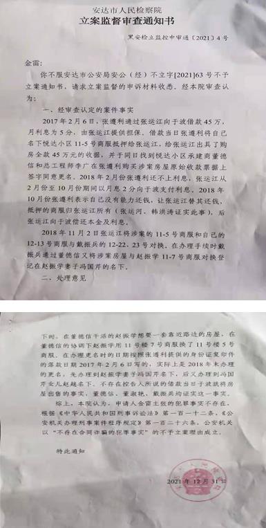黑龙江安达市公安局检察院办案不公,致使孤儿寡母无法生存挥泪上访,公理何在? 我叫金雷,是黑龙江省安达市人。我爱人张遵利(已去世)于2017年干建筑工程,留下很多外债,位于安达市悦达小区11一5号商服楼也被债权人骗走,我和我儿子现已无法生存,万般无奈,只好进京上访! 2017年2月份因张遵利干工程资金不足。找到张运河(早年在安达市开游戏厅,其社会关系复杂)借款,张遵利通过张运河,韩洪涛认识张运江(张运河的亲哥哥,是安达市最早最大最豪华的永利歌厅老板,其社会关系复杂,背景深厚),张遵利向张运江借款,张运江说我这也没钱,我帮你找一个贷款人吧,后来张运江找来于波,张遵利向于波借款45万元,于2017年2月6日当天达成协议。张遵利把位于安达市悦达小区11-5号商服楼作为抵押物,抵押给于波。 协议达成当天,张遵利从银行支出45,000元,作为先行给付于波2月份3月份的利息。张遵利从2017年4月份继续每月支付利息22,500元给于波。于2019年初,于波声称房子卖了,原因是张遵利还不上利息。 张遵利当时只同意把商服楼更名过户给出借人于波。不允许更名过户给其他人,更不允许出卖给其他人,当借款还清于波后,于波再把悦达小区11一5号商服楼更名过户给张遵利。后来在我和亲友们多方打探下,才知道此商服楼在2017年2月6日借款当天就给卖掉了,张遵利却毫不知情。张运江和于波把商服楼卖给了冯国芹,并且当天在开发商发票底联儿更名过了户。这是彻头彻尾的套路贷。张运江和于波涉嫌恶意侵占与诈骗罪。 张遵利同意把商服楼更名过户是作为抵押,不是买卖关系,如果是买卖关系,张遵利还用还利息吗?既然张运江和于波在2017年2月6日借款当天把房子就给卖掉,张遵利等于没有借于波的钱,商服楼既然给卖了,应该扣除已剩余的本金225,000元,把多余的房款(据买房人说,此商服楼花了90多万)还给张遵利,不应该产生任何利息。张运江也不应该给付于波每月2分利息,张遵利是5分高利息借款,说法不一,是在说谎。张运江和于波合谋把张遵利的抵押商服楼卖掉,并且收10个月的利息,张遵利共还利息款225,000元。在10个月以后,于波说不付利息把商服楼给卖掉了。其实商服楼早在2017年2月6日借款当天就给卖掉了,这不是有预谋的犯罪吗? 我于2021年7月6日到安达市公安局经侦大队立案。安达市公安局于2021年8月4日出具了不予立案通知书,没有不予立案的具体原因和内容,只是一张不予立案通知书。 期间有一次我去安达市公安局经侦大队立案,一位警察对我说,你把剩余的钱还了,楼房就给你。警察明明知道张遵利去世后,有很多外债,我哪有钱还?再说他们把我家商服楼卖了90多万元,张遵利借了45万元,我家的商服楼在借款当天就给卖掉了,于波收到了卖房款,等于张遵利没有借于波的钱,而且于波应把多余的差价还给张遵利。警察这么说,不是明显的偏向不公吗? 2021年8月末,我又到安达市检察院申请立案监督。 2021年12月31日,安达市人民检察院出具了不予立案监督审查通知书。安达市公安局和安达市检察院相关工作人员推诿塞责,只看问题的表象,不深入的调查取证,人云亦云。只听一面之词,只见树木,不见森林。不知是装糊涂?还是偏袒?并且证人都是直系亲友,证人证言没有法律效力。安达市人民检察院在立案监督审查通知书中说,张遵利借款时,于波收取砍头利息4.5万元,没有证据予以证实,是错误的。张遵利于2017年2月6日取款45,000元,是给于波2017年2月份3月份两个月的砍头利息,从还款记录中就可以看出,张遵利是从2017年4月份开始继续还8个月的利息。借款后张遵利两个月没有还利息,那么这两个月的利息就是他们拿走的砍头息4.5万元。张运江和于波在借款当日2017年2月6号把悦达小区11-5号商服就过户给冯国芹,有票据为证这是事实,证人证言是不可信的,是无效的。既然11一5号商服是用作抵押物,张遵利还不上借款利息,应该到法院起诉公开拍卖,或者张遵利和于波共同商量达成一致意见的情况下,才可以买卖商服楼。基于上述事实,张运江和于波是有预谋的犯罪。 我希望新闻网络媒体给予舆论监督,公开报道,维护法律的尊严,给予违法犯罪的张运江和于波绳之以法,对安达市公安局与检察院相关工作人员的渎职不作为给予追责,还事实真相,讨回对我的公道!如果我说的不是事实,我愿承担一切法律责任。 投诉人:金雷 身份证号码:23230219790621**** 2021年1月15日 |