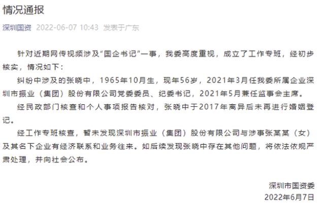 深圳市国资委在其微信公众号上通报,针对近期网传视频涉及“国企书记”一事,深圳市国资委委高度重视,成立了工作专班,经初步核实,情况如下: