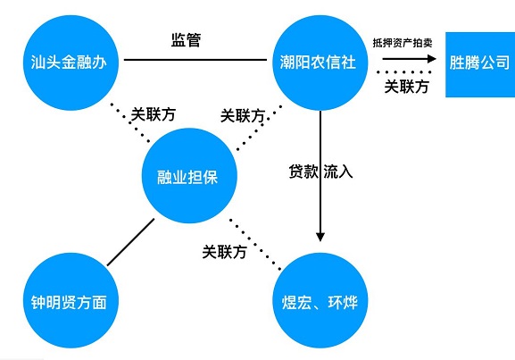 而仅有的5笔交易单中,也存在疑点。客户签章处,有的单据签字人为林松钦,有的单据签字人却为担保公司另一员工林晓生。林松钦作为钟明贤的贷款委托人,在单据上签字尚可理解。林晓生在名义上与该业务毫无瓜葛,却在单据上签字,让人摸不着头脑。 闭环链条 《华夏时报》记者此前发现,融业担保老板吴旭东通过自己的另一家公司融合投资,入股潮阳农信社;潮阳农信社的法定代表人肖希宁的弟弟肖希武,与融业担保的股东林某合开公司。 天眼查显示,前述报道刊发后,融合投资已经退出潮阳农信社,潮阳农信社法定代表人也已经变更,不再是肖希宁。而新的链条逐渐浮现。 记者发现,潮阳农信社和融业担保另有关联。肖希武除了与融业担保股东林某合开了两家公司,还与融业担保员工林晓生、李某芸是商业伙伴。潮阳农信社的签约律师、广东介福律师事务所的苏某生,亦为吴旭东代理过案件。 更令人震惊的是,一段钟明贤方面与融业担保前股东李子植的谈话录像,或显示前汕头市金融办主任、汕头市政府副秘书长林炳元入股融业担保。钟明贤方面称,李子植老婆和林炳元老婆是姐妹,潮汕话中,李和林的关系被称为“同门”。录像中,钟明贤方面要求李子植:“跟你同门(指林炳元)说下。”李子植则称:“找他不管事,股份小过阿吴(指吴旭东),说话没用。” 另外,钟明贤方面表示,林炳元的儿子名叫林某鸿。天眼查显示,林某鸿与融业担保老板吴旭东为商业伙伴——吴旭东参股了林某鸿名下的杭州某公司,为第二大股东;林某鸿担任董事的另一公司,与吴旭东共同参股杭州某企业。 《华夏时报》记者以从事担保业务的名义,联系了林某鸿本人。他表示父亲林炳元已经从金融办退休,不再处理这块业务。对于林炳元在融业担保是否有股份,他表示没听过这家公司,但当记者提到吴旭东的名字时,他恍然大悟,称有没有股份不知道,但如果是吴旭东的公司,那原来比较熟。不过最近不怎么联系了。 随后,记者又拨打李子植电话,未获接听,发送的提问短信也未获回复。 自此,钟明贤贷款事件的链条或已清晰——融业担保作为中间环节,向上连接了汕头市金融办和潮阳农信社,向下连接了贷款方钟明贤和接收贷款的两家公司。钟明贤抵押的资产被拍卖后,买下资产的胜腾公司则与潮阳农信社有关联。 |