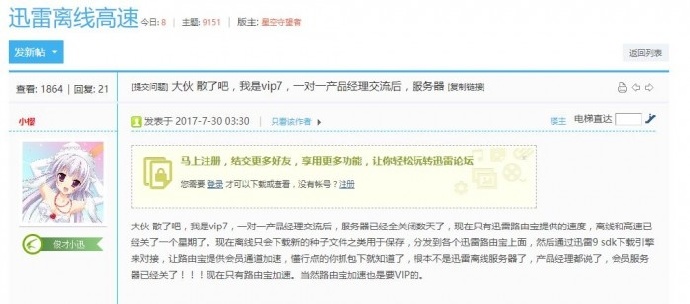近日网友使用新版迅雷9进行下载,不少资源的高速通道和离线下载功能都已失效。 刚去迅雷官方论坛看了一眼,好像确有此事,骂声一片。 据之前的公告称,离线下载和高速通道已经随着迅雷7软件一起下线了