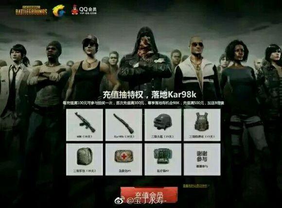 《绝地求生》早已成为Steam最火游戏,目前同时在线人数超越200万人,是第二名的《Dota 2》的3倍 而且在《绝地求生》累计1500万份销量中,中国玩家占比46%,鉴于国外服务器对中国玩家的不友好 腾讯代理《绝地求生》的传闻一直不断,此前,腾讯WeGame官方微博甚至发出消息,让大家敬请期待 不过随后立即删除了微博,让代理更加扑朔迷离,那么,如果腾讯真的代理《绝地求生》国服的话 QQ会员会有怎样的优势呢?有网友脑洞大开,带来了以下PS图: 充值送装备