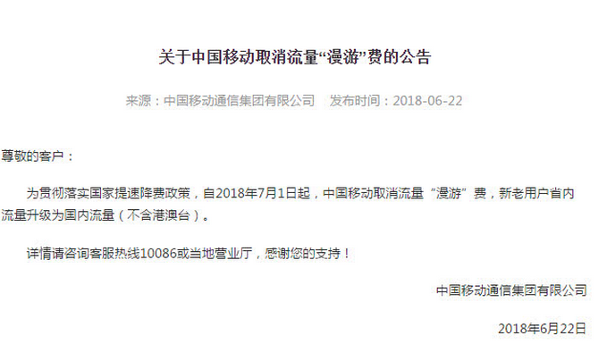移动联通7月1日取消流量漫游费