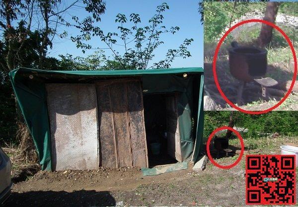 棚边摆着一小铁锅状的,法讯君以为是熬药所用。杨传习说是他们做饭用的,旁边的塑料桶用于提水,他们吃水得去上面水塘。法讯君看到铁炉下放着一些木棒,水桶里的水不浑浊但颜色泛黄。
