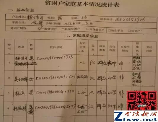 但实际情况是现在还是建档贫困户,家庭只有夫妻二人:因为家贫无法娶媳妇,儿子杨兵便成为别人家的上门女婿,于2016年迁走户口;至于什么杨家明则没有这个人,只有一个1986年出生的女儿叫杨家燕,在重庆上中专时就迁走户口了,此后一直没有迁回。