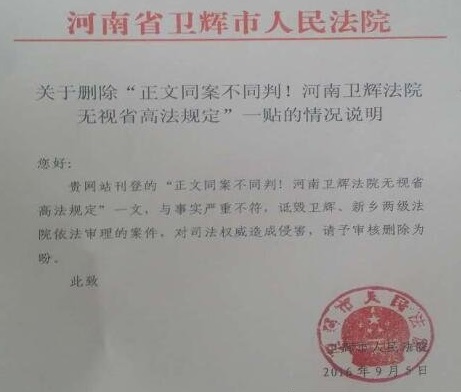 《同案不同判!河南卫辉法院无视省高法规定》后续 卫辉法院枉顾事实删稿为哪般 卫辉法院按照中华网河南频道样式做出的情况说明,没有任何实质证据说明失实 由伯丰、李堂平撰写的《同案不同判!河南卫辉法院无视省高法规定》在法讯网首发后在全国引起极大反响,目前有40多家网站予以转载。 9月4日中午《同案不同判!河南卫辉法院无视省高法规定》在中华网河南频道发布(http://hn.china.com/zhengzhou/news/11170504/20160905/23472420.html)。 当日下午卫辉法院研究室主任吉伟立便通过QQ找到中华网河南频道,提出删帖。编辑要求发情况说明并称:“简单的几句话,走个流程”。在得到编辑的情况说明模板后于4:30分通过QQ发送了以下情况说明,之后中华网河南频道删除了该文章。这里有什么交易,法讯君尚不得而知。 吉伟立QQ聊天时称:中国新闻网2011年5月22日以《农民摇身变“记者” 勒索官员老总封口费获刑》报道: 庭审中,邓大忠称其分得该款项的1万元,王朝科分得6000元,余款的15000元被其汇给李堂平(另案处理),让李堂平删除了《中国法讯网》、《中国民生网》上的两篇文章。综上可见法讯网、李堂平均有劣迹在前,属于没有底线的自媒体和撰稿人。 据悉吉伟立为卫辉法院研究室主任,多家报刊通讯员。从聊天记录看来这个吉伟立也是不顾事实,道听途说妄下论断之徒!这也不难看出卫辉法院的判案水准如何了。因为他看到这事情没有了解就下论断法讯网、李堂平均有劣迹在前!要删稿得说明该稿件的问题比如哪些地方不实,他不说这些具体问题而言其他。难怪卫辉法院判案难以服众!!一个法官得讲求法理情,从道理上说,真有劣迹还敢长期发批评稿署其真名?从法律上说,作为法院中层干部攻击别人,有证据么?知道其在《浙江景宁建设乱象调查:当地网友怨言多》一文里已经做出解释了么?:“针对《农民摇身变“记者”勒索官员老总封口费获刑》 一文报道“庭审中,邓大忠称其分得该款项1万元,王朝科分6000元,余款15000元被其汇给李堂平(另案处理),让李堂平删除《中国法讯网》、《中国民生网》上的两篇文章。其后,他又给《新早报》李志军汇款5000元钱,让其为申羽忠发表一篇正面文章。” 对此,本人不得不向景宁网友们答复:一篇报道开县公安局赔偿20万元引起的“双起”冤案,始作佣者是原重庆市公安局长王立军(现已进监狱),无辜陷害他人终遭报应。 对《同案不同判!河南卫辉法院无视省高法规定》,卫辉法院情况说明为“与事实严重不符”,该文发布的内容大部分是卫辉法院的判决书和中国法律专家、权威人士的论证书,附图为手写签名的《河南新乡医学院第一附属医院检验科室人员的请愿书》,请问哪些地方与失实严重不符?能否一一道来让大家评理? 若不能,如此不负责任地发函删帖只能证明卫辉法院心虚得很!! 中华网河南频道发稿截图 卫辉法院被曝问题多 其实在网上搜索卫辉法院负面信息一大片。 2010年1月21日110法律咨询网有帖子《卫辉法院法官违法行使职权给受害人造成巨大损失情况反映》,卫辉法院卫辉市人民法院 审判长:张闻华 审判员:李新根因违背法定程序、违法行使职权、枉法裁判导致受害人丧失了诉权、无法向实际肇事人追偿受害人已经支付过的12乘车人的医疗等费用。 ②要求卫辉法院因不履行法定职责、故意对应当采信的证据不予采信、故意违背事实和法律、滥用职权、枉法裁判造成受害人近10年为此交通事故案连续奔波而多支出的交通费、误工费、精神损失等费用。 百度贴吧的卫辉吧在2014年10月24日有一帖子《卫辉法院你执法为什么这么难???》反映的是卫辉市民吴玉清起诉倪保秀劳动报酬一案在2013年10月20号下判决书,2013年12月17号已申请的强制执行,至今已10个多月;期间他多次催促,仍毫无结果。百思不得其解,这究竟是为什么? 天涯论坛的天涯杂谈栏目2014年8月20日《河南卫辉法院执行民警充当流氓恶霸的保护伞》,该文同天在中国青年网河南频道发布。反映人张宏彬2011年一起民事案件被卫辉市人民法院依法判决后,两年多来,经我多次多方奔走相告,却没有得到一点实质性的进展。从法院判决到我申请强制执行,卫辉市法院王爱华受理该案件,我们多次要求强制执行,卫辉市法院王爱华一直要求我们提供流氓恶霸相关财产情况,作为一个小老百姓,了解流氓恶霸财产相当困难,然而每次我费尽周折提供给卫辉市王爱华相关流氓恶霸财产后,卫辉市王爱华警官总是以“没时间”、“需要核实”、“理由不足”敷衍搪塞我,不久后流氓恶霸马上就很神奇的针对我要求执行的财产进行转移,然后卫辉市王爱华警官就堂而皇之的告知我执行不了。 他反映了2点无奈:1、在法院判决书生效,我申请强制执行后,有关办案人员为什么不迅疾查封流氓恶霸及其父母在卫辉市李元屯镇牌杨庄新濮路边8间门面房、耕地,并冻结相关账户等,还徇私枉法,通风报信,包庇纵容!出具假证明,知法犯法!我很无奈,我怀疑卫辉市有司法机关的领导在为他们开脱讲情,甚至干涉了检察机关办案,现在卫辉市检查机关办案也有了阻力,按照现在各方给我的答复,我的案件永远不可能有结果,流氓恶霸永远不会得到惩治,卫辉隐藏在背后的黑社会势力的保护伞永远会逍遥法外,将会有很多象我一样的无辜可怜的弱势百姓任他们欺凌。 2、从强制执行起,我多次请求卫