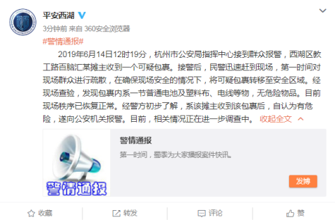 据@平安西湖 2019年6月14日12时19分,杭州市公安局指挥中心接到群众报警,西湖区教工路百脑汇某摊主收到一个可疑包裹。接警后,民警迅速赶到现场,第一时间对现场群众进行疏散,在确保现场安全的情况下,将可疑包裹转移至安全区域。经现场查验,发现包裹内系一节普通电池及塑料布、电线等物,无危险物品。目前现场秩序已恢复正常。经警方初步了解,系该摊主收到该包裹后,自认为有危险,遂向公安机关报警。目前,相关情况正在进一步调查中。