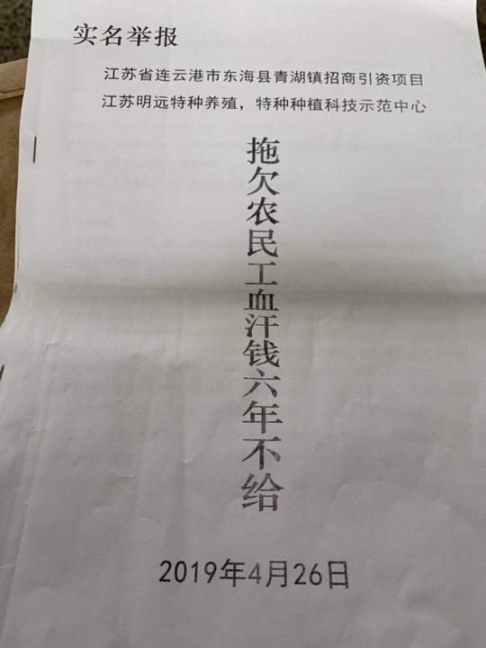 江苏省东海县:涉骗企业与官员同台“演戏” 拖欠河南民工百万血汗钱六年不给 维权记者 张妍 江苏省东海县青湖镇上演了一幕“(招商引资“搭台” 涉嫌诈骗企业与官员同台“演戏” 拖欠河南民工百万血汗钱六年不给)”的人间苦剧...... 江苏省东海县青湖镇招商引资企业:江苏明远特种养殖科技发展有限公司(以下简称“明远公司”)法人 石柏顺打着政府重点招商项目的旗号,利用地方政府官员特殊身份出席剪彩其项目开业奠基之影响,面向全国招合作建设单位,采取包工包料的形式,从中收取他们各种名号的的押金、保证金等,待合作单位建设完工后,不仅要不回自己的本金和押金,连干活的农民工的工资都打了水漂。许多与其合作建设单位的老板因此被拖得破产,为要回自己的本金和农民工资长年累月奔走在信访告状的途中。河南省平舆县津程水利水电工程有限公司梅得付(后委托农民工代表徐成忠)就是其中一位。 近日,记者收到河南省正阳县数名农民工的实名投诉:反映江苏省东海县青湖镇政府招商引资项目:江苏明远特种养殖,特种种植科技示范中心拖欠一百余万元农民工血汗钱六年不给。六年来,为要欠薪,他们前往青湖镇政府、东海县信访局、县劳动监察大队、连云港市信访局、江苏省信访局等单位,均以各种理由和借口不予处理。找涉骗公司要欠款,轻者吃顿老拳、重者打伤致残。绝望中的农民工兄弟向媒体求助,并追问难道这些拖欠我们农民工工资的现象在江苏省就没人管吗? 7月26日,记者前往河南、江苏,核实相关投诉,受害农民工徐成忠含泪讲述了六年来为讨薪所经历的酸甜苦辣。  一、信访维权难于上青天 实名举报信显示: 举报人:徐成忠,男,412829196++++50073、居住河南省正阳县真阳镇街道办事处,联系电话:13949++++72 被举报人:江苏省东海县青湖镇政府和江苏明远特种养殖科技发展有限公司 举报事项: 江苏省连云港市东海县青湖镇招商引资项目:江苏明远特种养殖特种种植科技示范中心拖欠农民工血汗钱六年不给 事实与理由: 2013年3月河南省平舆县津程水利水电工程有限公司梅得付与江苏明远特种养殖科技发展有限公司法人石柏顺签订建设工程施工合同。工程名称:江苏明远特种养殖、特种种植科技示范中心建设项目。工程地点:连云港市东海县青湖镇。合同签约后,梅得付通过熟人找到我,我联系当地农民工三十多人干半年多;完工结算共欠三十余名农民工工资近108万余元。几年来我多次催要,只给付了少部分,不仅如此,我本人干活前向发包单位江苏明远特种养殖科技发展有限公司所缴纳的按期完工合同保证金、农民工施工保证金及其他保证金,均没退还,多次信访都不了了之。几年来我往返上百次找当地相关部门和明远公司石柏顺催要,开始时石柏顺称我这个公司是当地政府招商引资过去的,建设的项目为市、县、镇三级政府重点建设项目,缴纳的保证金和押金用在了建设项目上,民工工资和保证金应该找镇政府要,因为镇政府是这个项目的受益人。后来再找明远公司石柏顺催要,都遭到其多名保镖暴力威胁和殴打,轻者吃顿老拳、重者打伤致残,打人者逍遥法外无人管。无奈于2019年5月25日下午我们再次去东海县劳动监察大队,该大队曾经参与处理该项目拖欠民工工资和工程款的领导王某说:这件事是属地管理,县里有文件规定,谁招商谁管理谁负责。那个项目是青湖镇党委招商的,只有青湖镇才有权解决。记得2013年青湖镇党委政府把徐州公司的人叫到青湖镇政府,在青湖镇政府的楼上专门开会解决这个项目的拖欠工资及工程款纠纷,有会议纪要,你们应该到青湖政府去。 5月27日,我们又来到青湖镇政府信访办反映我们的诉求,把县劳动监察大队王队长说的话重复了一次,接待我们的王文辉呵呵一笑说,你们别太天真了,听他胡言乱语。再次把我们打发走。