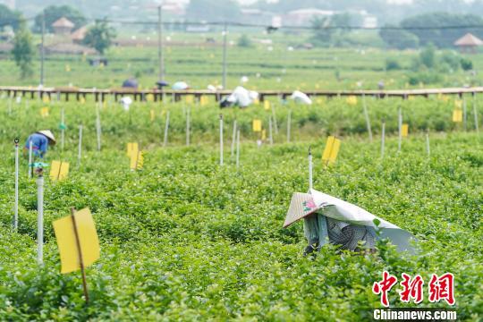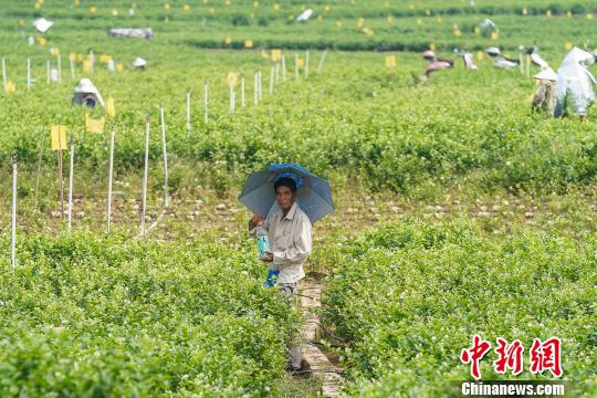 花农在35摄氏度的高温下“全副武装”采摘茉莉花 陈冠言 摄8月15日,广西横县校椅镇中华茉莉园内,花农在35摄氏度的高温下“全副武装”采摘茉莉花。横县茉莉花种植面积达11万亩,约有花农33万人。2018年横县茉莉花产业综合产值近105亿元,产出茉莉鲜花9万吨,茉莉花茶7万吨,两者均占全国80%以上、世界60%以上。 花农在35摄氏度的高温下“全副武装”采摘茉莉花 陈冠言 摄 花农在35摄氏度的高温下“全副武装”采摘茉莉花 陈冠言 摄 花农在35摄氏度的高温下“全副武装”采摘茉莉花 陈冠言 摄![]() ![]()