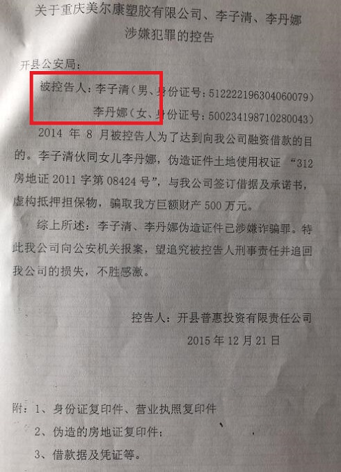 | 涉案3亿,受害人达3000! 重庆市开州区李子清仅被判刑18年引质疑 民呼撰稿人 李海波 李珠维 重庆市开州区的李子清和妻女一起用非法集资的钱成立美尔康公司以发展之名骗取250多户3000人及国家3亿余元!而为了骗钱他们多次利用假证将自己房产、股份多次分别抵押或出售他人。他们骗钱花样百出,有谣言引诱、有道具诱骗工有他人配演、有实物配合;受害人多为退休老人。其实他们骗人对象也不分,无论男女老弱、亲戚朋友、新识故旧、贫寒病残,无论是达官贵人或是村组干部,亦或是富豪巨贾或小商小贩、哪怕是捡垃圾的、残疾人工低保困难户、甚至生命垂危的尿毒症癌症患者,一概通吃!就连本公司内部的工人那些养家糊口的钱也被其洗劫! 受害人报案后多次举报投诉近4年后才在诸多事实没有查清的情况下以李子清是投案自首和坦白情节才判刑18年、妻子朱显玉以坦白从轻判刑3年半,作为大股东和另外关联公司法人的女儿以及公司总经理等高管却没有任何责任...... ![]() 高利借贷包装成知名企业 制假证骗钱达3亿挥霍 2004年,李子清成立重庆吉尔塑料有限公司,其实就是一个经营困难的小企业。为了致富,他以技改为幌子,从2008年就开始高息集资。2009年,忠县人姜圣经财务总监蒋宜俊进入公司(据悉此二人均与县里领导有关系)。 2010年6月3日,重庆美尔康塑胶有限公司(以下简称美尔康公司)登记成立,李子清向他人借款一千万元作为美尔康公司的注册资金,登记次日将1千万退还他人。李子清任美尔康公司法定代表人,朱显玉任公司股东及出纳。公司入住赵家工业园区并修建厂房。没钱的李子清便想法四处高息集资,承诺2至6%的月利息。 2013年,美尔康公司将生产餐具的车间分出去成立了重庆独麦瓷器公司,占股75%的李丹娜任法人代表。 2014年9月12日,李子清安排注册开县独到农业科技公司,姜圣投资155万元、朱显峰投资145万元。姜圣为法人。2014年底,资金链断裂的李子清将从银行贷款用于发工人工资和支付货款的250万元转给独到公司,至今没有下落。 胆大包天的李子清一伙还伪造了9本房地产权证、土地证做抵押骗取巨额资金达2千万元以上。 ![]() 2013年,李子清在龙头寺做了一个假房产证给张珠亮,并称将公司和家庭财产做抵押,获得600万元。 这种将自己和公司所有财产抵押的合同比比皆是 2012年,李子清用二本假房产证做抵押向杨生碧借款10万元。2011-2014年,罗玉成借给李子清400万元,称将公司75%的股份和4本房产证抵押。经鉴定有一本为假证。 2014年12月,李子清家人利用假房产证诱骗二人为其贷款担保,之后被银行告上法庭,而庭审时作为被告的李子清一家三人都没有到庭,之后王云科和孟萍的这2套房屋被判拍卖,独麦公司及李丹娜等人承担连带责任。 ![]() 2014年李子清和李丹娜以美尔康公司的名义,制作出虚假的美尔康公司的房产证向普惠投资公司做担保借款650万元,转入其个人账户。普惠公司书面向开县公安局报案,没有处理。 李子清骗钱连老同学也不放过。2014年,他和家人一起向蒋永忠借款450万元,为此将4本房产证做抵押。但此款一到手,他便立即注销了房产证。 ![]() 2014年10月,公司总经理姜圣作为操盘手,以发行原始股票为名,骗取多名受害人达3千万元。 而为了达到侵占受害人财产,2014年至2015年1月李子清及美尔康公司出具假借条虚列债务达千万之上:总经理姜圣虚造债务608万元,财务总监蒋宜俊108万元,周远飞580万元,何文亮160万元! 法院查明:2008年至2015年期间,因美尔康公司成立及扩大生产,被告人李子清、朱显玉在美尔康公司不具备吸收存款资质的情况下,通过自己及他人“口口相传”的方式向社会公开宣传,并承诺付以2%至6%的月利息,向社会不特定公众郭世荣、梁爱红、张弢、李启俊等252人吸收存款242189774元,其中朱显玉参与吸收公众存款38594500元。李子清、朱显玉将吸收的资金用于公司日常运作、投资、支付利息及个人消费。而这些资金仅有1281.7万元进入公司账户,其余全进入了李子清和妻子朱显玉、女儿李丹娜的个人账户里。 这些钱到了李子清手里,是用于发展生产了吗?知情人透露他过着紫醉金迷的生活:保养小三何某,为其买两辆小轿车、在侨城丽景给她买房一套、在重庆观音桥商圈为其投资开文具店一个,另外还给了巨额现金……为此何某为李子清生育了一儿子。 除了向250多人集资外,李子清还向重庆农商行、重庆银行等银行以及贷款机构贷款1亿余元,贷款到手后资金也不入企业账,被总经理姜圣打入外地账号又多次转账,最后进入朱显玉账户。 除了集资3亿多元外,作为其鼓吹是私营企业家的李子清却玩起来侵占公司财产的把戏:在开县税务局虚开设备价款发票入账报销套取资金1千万多元;厂房建设成本每平方750元他报账成1500元,让承建商将多余款项打进他个人账户(检方认定建厂房购置设备金额约4731万元,李朱开假发票报账9000多万元,在年年巨亏的企业里贪污约4000万元);2012-2014年,通过将银行贷款转入业务单位再转入李子清夫妇个人账户贪占企业资金169.83万元和3561.7万元。 2011年到2014年间李子清等以各种欺骗手段,钻国家政策空子,骗取国家各项补助资金1700万元,此款是专款专用,但是他又将其中的800多万元转到李子清的妻子朱显玉卡号上。这1700万元的补助资金,却没有可查去向。 谎言揭穿疑点重重 作为大案重犯的李子