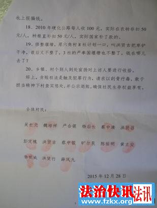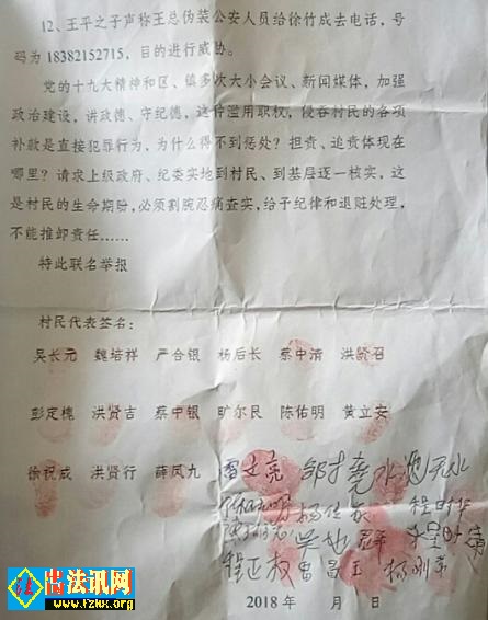 2015年12月28日吴长元等村民们列举了针对金峰镇大义村支书王平的20个问题进行了举报。但他没有得到任何处理。