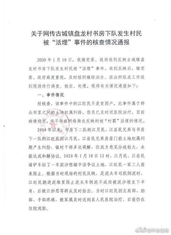 广西陆川县古城镇人民政府通报,1月19日,我镇党委、政府收到反映古城镇盘龙村书房下队发生村民被“活埋”时间。收到反映后,镇党委、政府高度重视,及时组织镇综治办、派出所组成工作组到现场进行调查、核实、处理。