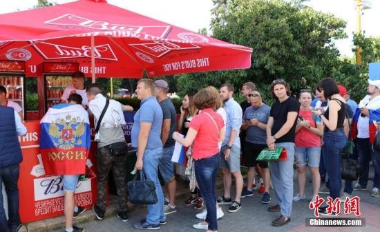 25日,莫斯科麻雀山上,一杯啤酒的售价为300卢布(约30元人民币)。尽管这一价格比其他地方贵不少,但几乎每个卖酒摊位前,都排起了长队。