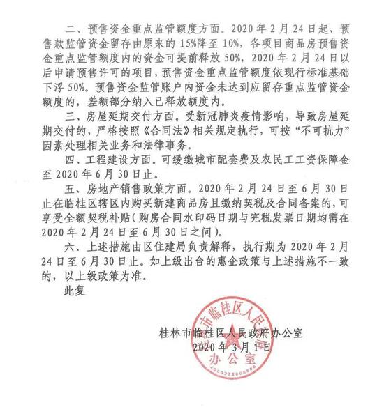 3月1日,桂林临桂区人民政府办公室发布《关于临桂区房地产企业扶持有关问题的批复》,批复文件中关于临桂区房地产开发项目的房屋预售、延期交付、工程建设、房屋契税等问题提出相关措施,其中包括6月30日前在临桂购房可享全额补贴契税! ![]() ![]() 文件批复中提到:房地产销售政策方面 2020年2月24日至6月30日止在临桂区辖区内购买新建商品房且缴纳契税及合同备案的,可享受全额契税补贴。 ![]() 政策解读 就在今年2月25日,钦州市人民政府办公室发布通知:3月份在该市本级购买新建商品房(含住宅、商业、办公)的,按已缴契税为基数,契税补贴比例为100%;4月份契税补贴比例为80%;5、6月份契税补贴比例为50%。 相比钦州的相关措施,临桂区其次补贴力度更大,在2016年,临桂区曾对购买新建商品住房实行财政补贴,时隔4年,临桂购房契税补贴再现,政府扶持房地产企业的力度可见一斑。 桂林购房契税补贴的机会并不常见,4年前,补贴政策让桂林楼市转暖,今年上半年或许是在临桂买房的一个好时机…… 资料来源:临桂区人民政府办公室 |