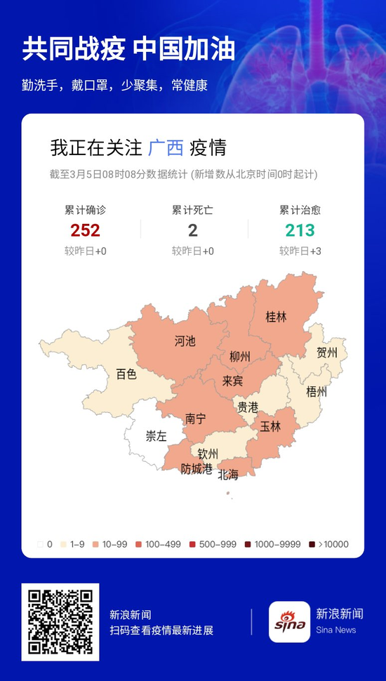 来源:自治区卫生健康委员会 ![]() 3月4日0-24时,我区无新增新型冠状病毒肺炎确诊病例;无新增疑似病例;新增治愈出院病例3例(桂林市1例,北海市1例,河池市1例);无新增死亡病例。 ![]() 目前全区累计报告确诊病例252例,累计出院病例213例,累计死亡病例2例(河池市1例、北海市1例),现有确诊病例37例,均在院治疗,其中危重病例5例(南宁市1例、北海市1例、防城港市2例、河池市1例);现有疑似病例0例。 累计确诊病例中,南宁市55例、柳州市24例、桂林市32例、梧州市5例、北海市44例、防城港市19例、钦州市8例、贵港市8例、玉林市11例、百色市3例、贺州市4例、河池市28例、来宾市11例。 ![]() 本日新增密切接触者1人,现有202人正在接受医学观察。 随着复工复产有序推进和应急响应调整降级,宅在家里多日的不同人群,有的开始复工上班、有的开始逛商场购物、有的开始外出郊游,等等,但大家外出回家后都有一个大问号?是否会把病毒带回家、是否要消毒、怎样进行消毒。专家建议,基本原则是“清洁为主、消毒为辅。”一、头发。不需专门洗头或是消毒,保持头部清洁即可;若到人员较密集的公共场所,可选择戴帽或将头发盘起,减少头发曝露在外的面积。二、外衣。回家后将外衣挂在阳台通风,外穿的衣物和居家服要分开;若外套可能被污染,要进行消毒处理。三、鞋底。回家换鞋后,将鞋放在通风处,不需要每次外出回来都对鞋底进行消毒,保持清洁即可。四、双手。日常会触碰到很多东西,若手被污染碰到口、鼻、眼等身体粘膜时,可能会被感染,应做好手卫生、勤洗手。五、手机。可用75%酒精喷洒或用棉布蘸取擦拭手机表面,有手机壳也同步进行消毒。六、口罩。回家摘口罩时,不要接触口罩最脏的外侧,拿住挂耳绳取下即可。七、空气和物体表面。可用紫外线灯对室内空气和物体表面进行消毒,也可用过氧乙酸或二氧化氯进行空气喷雾消毒和用含氯消毒剂进行物体表面擦拭消毒。八、开窗通风。每天至少开窗通风两次,每次通风30分钟左右。总之,消毒要科学适度,过度消毒可能有害。 |