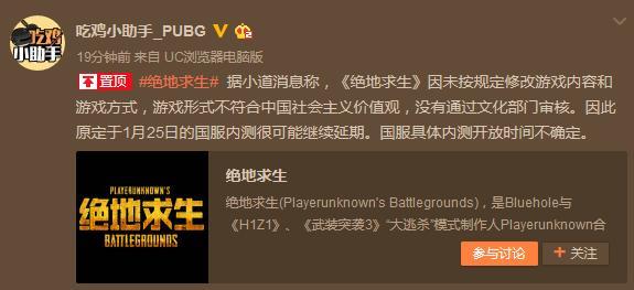 微博“吃鸡小助手”也透露了关于吃鸡游戏未过审的消息