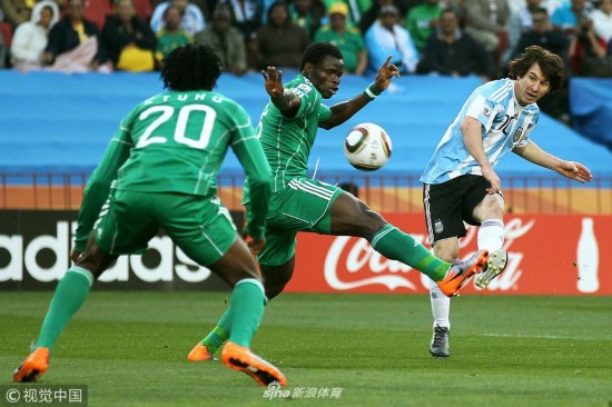 2010年6月12日,南非约翰内斯堡,2010世界杯B组小组赛,阿根廷Vs尼日利亚。丹尼·希图带球突破。