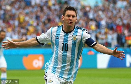 2014年6月25日,巴西贝拉里奥球场,2014巴西世界杯小组赛F组,尼日利亚Vs阿根廷。 梅西在打入第一粒进球后庆祝