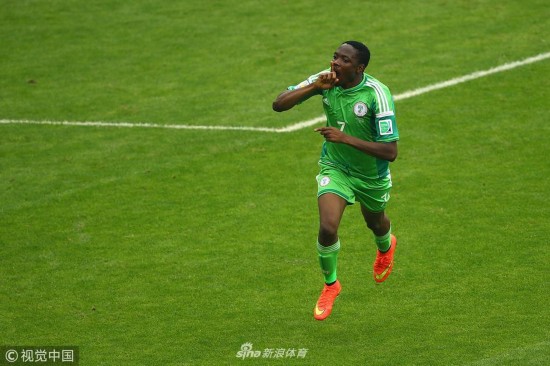 2014年6月25日,巴西贝拉里奥球场,2014巴西世界杯小组赛F组,尼日利亚Vs阿根廷。 穆萨在打入第二粒进球后庆祝