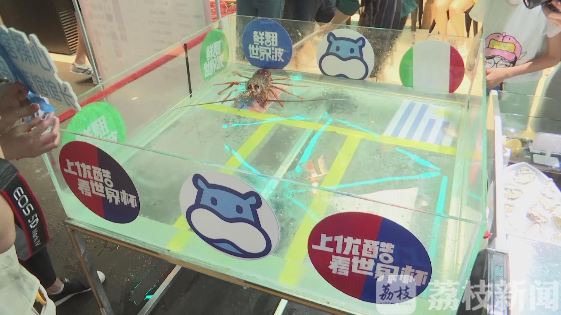 这只大龙虾名叫"瞎操心",就生活在南京夫子庙一家生鲜店里,生鲜店会为"瞎操心"准备两面国旗,分别代表当天晚上角逐的两个球队。“瞎操心”同学爬到哪个国旗边,就代表它押宝哪支球队获胜。