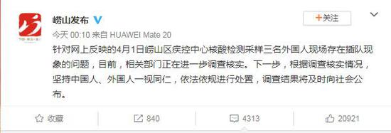 原标题:外籍人士青岛核酸检测野蛮插队 官方回应:一视同仁将依法处置 来源:半岛网 半岛网4月2日讯 4月1日,崂山区某社区卫生服务中心排队检测核酸时,有三名外籍人士强行插队,在遭到正常排队市民谴责后,一名外籍人士将居民手中单据扔在地上,并叫嚣:“中国人出去”。 就此事崂山区人民政府新闻办公室2日凌晨发布微博回应: 针对网上反映的4月1日崂山区疾控中心核酸检测采样三名外国人现场存在插队现象的问题,目前,相关部门正在进一步调查核实。下一步,根据调查核实情况,坚持中国人、外国人一视同仁,依法依规进行处置,调查结果将及时向社会公布。 4月1日20时,青岛市崂山区卫生局官微“崂山卫计官微”也第一时间就此事发文致歉,称将加强服务管理和秩序引导,采取有力措施维护好现场秩序。 半岛网记者 宗瑞琪 聚焦新型冠状病毒肺炎疫情新浪小圆桌 就等你来说 |
