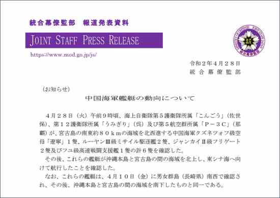 | (观察者网讯)据日本防卫省统合幕僚监部网站4月28日消息,28日上午,日本海上自卫队驱逐舰“金刚”号、“海雾”号与P-3C反潜机在宫古岛东南80公里处发现中国海军辽宁舰航母编队。辽宁舰编队随后经宫古海峡,进入东海。此前,统合幕僚监部曾于10日发布消息,称辽宁舰编队穿越宫古海峡,驶入太平洋。 ![]() 统合幕僚监部网站截图 编队包括航母辽宁舰、052D型导弹驱逐舰西宁舰、贵阳舰、054A型导弹护卫舰枣庄舰、日照舰、901型远洋综合补给舰呼伦湖舰共6艘舰艇。 ![]() ![]() 辽宁舰编队 图自统合幕僚监部网站 据此前报道,辽宁舰航母编队于4月10日穿越宫古海峡,驶入太平洋。4月13日,海军新闻发言人高秀成介绍,根据年度计划安排,中国海军组织辽宁舰航母编队跨区机动,于近日航经宫古海峡、巴士海峡,到南海有关海域开展训练,这是年度计划内的例行性安排,符合国际法和国际惯例,今后中国海军仍将按计划常态组织类似演训活动,加快提升航母编队体系作战能力。 ![]() 901型远洋综合补给舰呼伦湖舰并未被海自拍到 图自统合幕僚监部网站 台军23日发布消息,称解放军辽宁舰航母编队昨22日结束南海训练后,再次航经巴士海峡续向东航行。 ![]() 辽宁舰航拍图 图自台媒 |