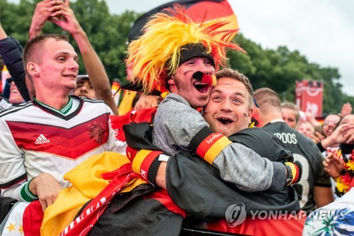 对阵瑞典比赛中,德国队进球后球迷欢呼(图片来源:韩联社)