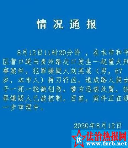据澎湃新闻报道。12日中午,天津一67岁男子刘某持刀在一交叉路口行凶,导致两名过路女性遇害,一人死亡一人轻微划伤。男子已被警方控制,关于是否是无差别行凶,警方正在进一步调查中。 67岁男子持刀袭击路人,致一死一伤 事情发生在和平区营口道和贵州路的交叉处,天津市第一中学在附近。据视频画面显示,一名身穿蓝色条纹短袖衬衣、白色裤子的老人持刀对过路的两名女性进行了攻击。 ![]()