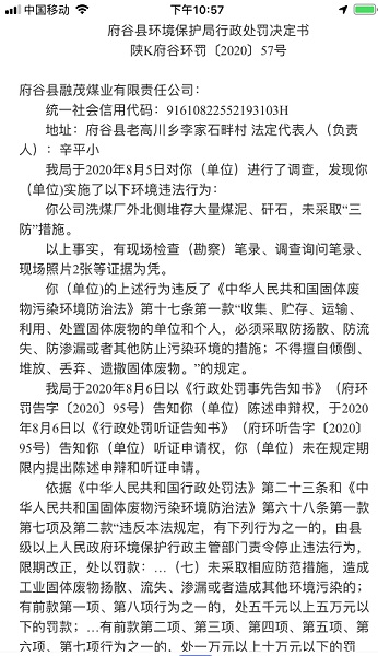 陕西府谷县融茂煤业因环境违法一年里三次被处罚 法治前沿【cnlaw.top】消息(撰稿人 李海波)日前,前沿君从府谷县政府网站得知,从2019年8月1日到今年8月17日的一年时间内,府谷县融茂煤业有限责任公司因为环境违法行为被府谷县环境保护局三次处罚。 2019年8月1日下达的府环罚〔2019〕118号府谷县环境保护局行政处罚决定书显示:府谷县环境保护局于2019年7月3日对融茂煤业有限责任公司进行了调查,发现融茂煤业公司实施了以下环境违法行为:公司工业场地内大量原煤、煤泥、煤矸石露天堆存,未采取防扬撒措施。以上事实,有现场检查(勘察)笔录、调查询问笔录、现场照片等证据为凭。融茂煤业有限责任公司上述行为违反了《中华人民共和国大气污染防治法》第七十二条第一款“贮存煤炭、煤矸石、煤渣、煤灰、水泥、石灰、石膏、砂土等易产生扬尘的物料应当密闭;不能密闭的,应当设置不低于堆放物高度的严密围挡,并采取有效覆盖措施防治扬尘污染”的规定。据《中华人民共和国行政处罚法》第二十三条和《中华人民共和国大气污染防治法》第一百一十七条第一款第一项“违反本法规定,有下列行为之一的,由县级以上人民政府生态环境等主管部门按照职责责令改正,处一万元以上十万元以下的罚款;拒不改正的,责令停工整治或者停业整治:(一)未密闭煤炭、煤矸石、煤渣、煤灰、水泥、石灰、石膏、砂土等易产生扬尘的物料的”的规定及《陕西省环境行政处罚自由裁量权基准》(第十一类第二项“不属于从轻或从重情形的,处3万以上5万元以下罚款”)的规定,我局决定对你(单位)处以如下行政处罚:处以罚款伍万元整。 2020年3月27日,府谷县环境保护局下达府环罚〔2020〕13号府谷县环境保护局行政处罚决定书:2019年3月11日府谷县环境保护局对府谷县融茂煤业有限责任公司进行了调查,发现该公司实施了以下环境违法行为:公司车辆未采取措施防止物料遗撒,造成道路扬尘污染。依据《中华人民共和国行政处罚法》第二十三条和《中华人民共和国大气污染防治法》第一百一十六条“违反本法规定,运输煤炭、垃圾、渣土、砂石、土方、灰浆等散装、流体物料的车辆,未采取密闭或者其他措施防止物料遗撒的,由县级以上地方人民政府确定的监督管理部门责令改正,处二千元以上二万元以下的罚款;拒不改正的,车辆不得上道路行驶。的规定。该局决定对融茂煤业有限责任公司处以如下行政处罚:罚款(大写):贰万元整。 2020年8月17日,府谷县环境保护局下达的府环罚〔2020〕13号府谷县环境保护局行政处罚决定书显示:府谷县环境保护局于2020年8月5日对府谷县融茂煤业有限责任公司进行了调查,发现府谷县融茂煤业有限责任公司实施了以下环境违法行为:公司洗煤厂外北侧堆存大量煤泥、矸石,未采取“三防”措施。依据《中华人民共和国行政处罚法》第二十三条和《中华人民共和国固体废物污染环境防治法》第六十八条第一款第七项及第二款“违反本法规定,有下列行为之一的,由县级以上人民政府环境保护行政主管部门责令停止违法行为,限期改正,处以罚款:…(七)未采取相应防范措施,造成工业固体废物扬散、流失、渗漏或者造成其他环境污染的;有前款第一项、第八项行为之一的,处五千元以上五万元以下的罚款;…有前款第二项、第三项、第四项、第五项、第六项、第七项行为之一的,处一万元以上十万元以下的罚款。”和《陕西省环境行政处罚自由裁量权基准》第十五类第五项“当事人不属于从轻或从重情形的,处3万元以上6万元以下的罚款”的规定,府谷县环境保护局决定对府谷县融茂煤业有限责任公司处以如下行政处罚:罚款(大写):伍万元整。 据了解,融茂煤业有限责任公司成立于2010年,注册资金3000万元人民币,注册地位于陕西省榆林市府谷县老高川乡李家石畔村,法定代表人为辛平小。经营范围包括煤炭、焦粉、矿山机械设备、工程机械设备销售(依法须经批准的项目,经相关部门批准后方可开展经营活动)。 据报道,陕西省生态环境厅环境执法局局长马小现介绍,2019年,陕西省各级生态环境部门共检查企业69592家(次),对环境违法问题立案7627家,办理一般行政处罚案件5539件,处罚金额34084.66万元,较2018年增加645.69万元。实施按日连续处罚案件52件,处罚金额580万元;对1144家企业违法排污设施实施了查封扣押;对229家存在环境问题企业实施限制生产和停产整治;对183家环境违法问题企业负责人或直接责任人实施行政拘留处理;向公安司法机关移送涉嫌环境污染犯罪案件12起。 陕西省如何处罚环境违法企业的?《2019年陕西183家企业责任人因环境违法被行政拘留》报道里,陕西省生态环境执法总队总队长胡世军说:“对生态环境违法行为初犯且问题轻微的企业,我们视情给予一定的整改期限,避免‘一律先处罚后整改’或者‘以罚代改’等简单做法,给企业一定的缓冲期;对于一般生态环境违法行为慎用查封、扣押等措施,严格禁止‘一律高限处罚’等做法,不断促使企业自觉守法,以良好诚信搞好经营活动。” 前沿君于12月23日到现场调查村民投诉其有关问题时,拍摄的融茂煤业现场 |