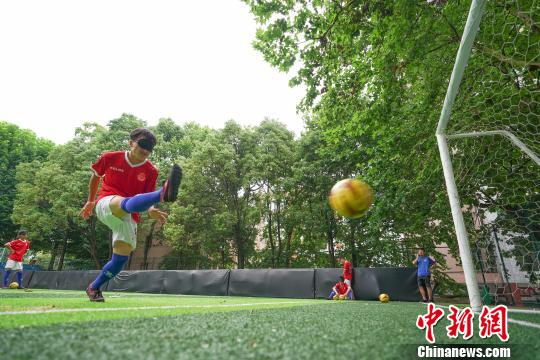 盲人足球队员王志华在训练射门。贺俊怡摄