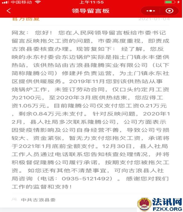 要了多次工资未果的王泰山无奈之下于2020年12月12日在人民网的“领导留言板”给武威市委书记留言反映《干活容易要工资难》,2021年1月4日得到了古浪县委答复:2020年12月,县人社局多次联系隆腾公司,公司方面表示因受疫情影响及公司自身经营不善,导致公司亏损较大、资金紧张,暂无力支付您拖欠工资,承诺将于1月底前全额支付。12月30日,县人社局工作人员通过电话联系您告知核查处理情况,并将积极督促隆腾公司履行承诺,按期支付您被拖欠工资。