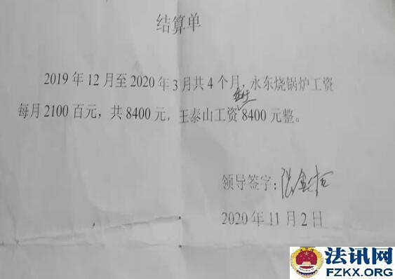 2019年11月迫于生计的王泰山带病找到了一份工作:在永东村东边的古浪县隆腾实业有限公司修建并运营的永丰堡供热站从事烧锅炉工作,没有签订劳动合同,仅口头约定月工资为2100元。到了2020年的3月底供热结束,他没有上班了,而他仅拿到了一个月的工资即2100元。拖欠的8400元工资他要了多次再没有得到一分钱,只是在11月2日给他出具了一份结算单。