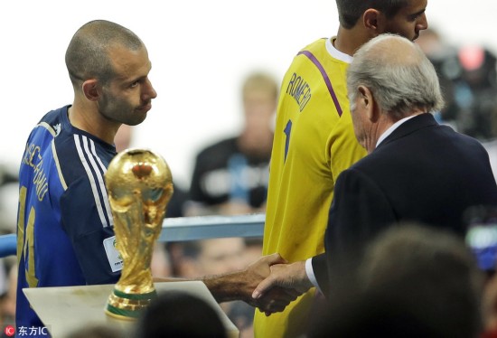当地时间2014年7月13日,里约热内卢马拉卡纳大球场,2014巴西世界杯决赛,德国1-0阿根廷.马斯切拉诺在大力神杯前与布拉特握手