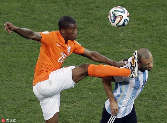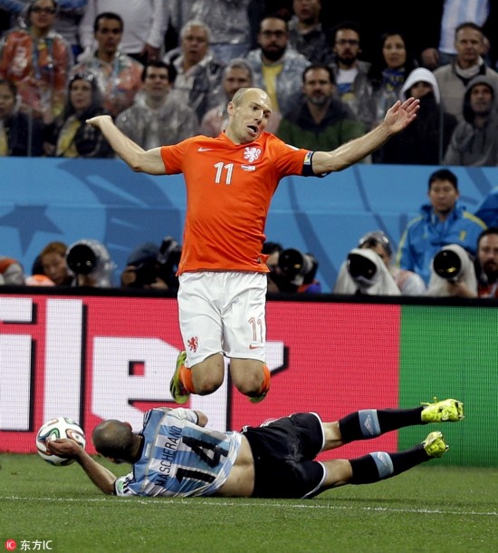 当地时间2014年7月9日,圣保罗科林蒂安体育场,2014巴西世界杯半决赛,荷兰0-0阿根廷。点球大战,荷兰队首先出场的弗拉尔和第3个出场的斯内德射门均被阿根廷门将斯内德扑出,阿根廷出场的4人将球全部打进,荷兰2-4不敌对手。马斯切拉诺血染赛场。