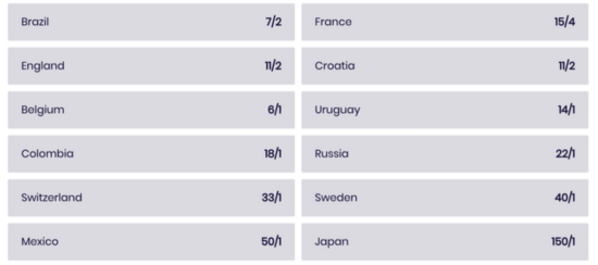在世界杯夺冠赔率上,巴西位居第一(3.5),西班牙出局之后,法国升到了第二(3.8),英格兰也因此排名上升到第三(5.5)。克罗地亚晋级后被看好升到第4,此前仅第8。