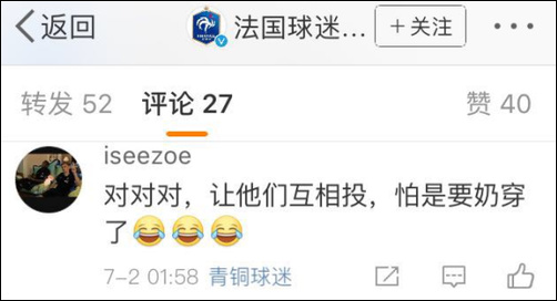 法国队球迷不仅高瞻远瞩顺便奶了比利时,还能分神看戏:让他们互相把自己奶穿!我们坐收渔翁之利!