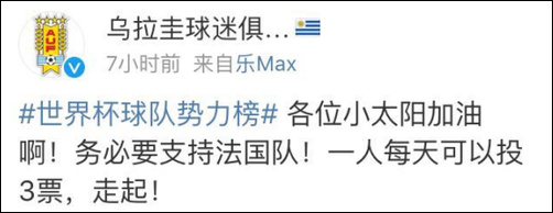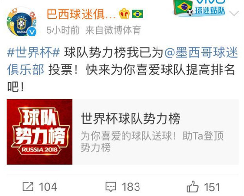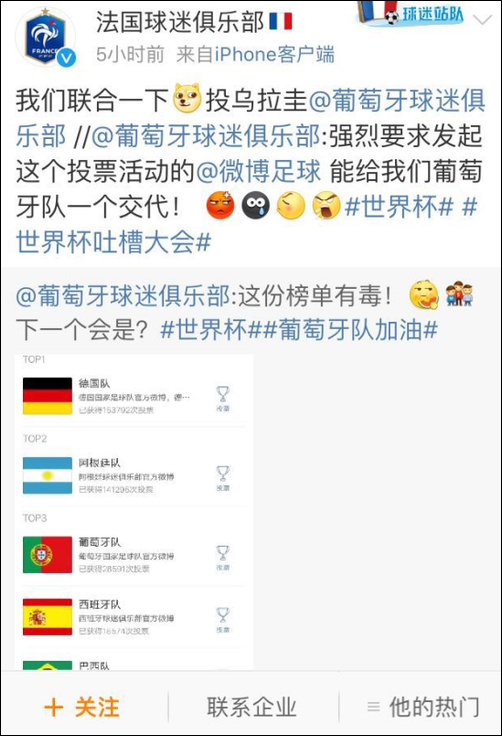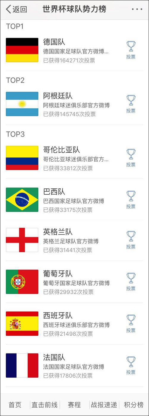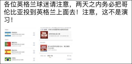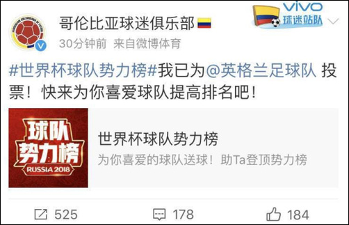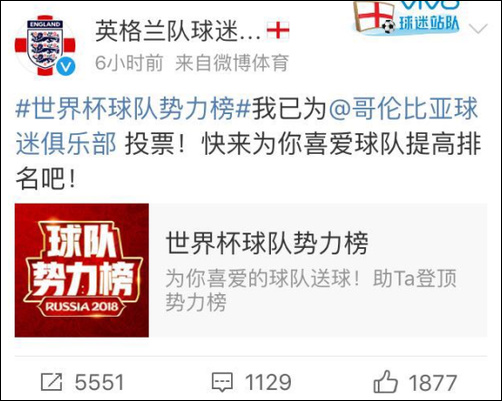 于是,英格兰球迷开始疯狂给哥伦比亚队刷票,@英格兰队球迷俱乐部 出动,号召广大球迷一起上。