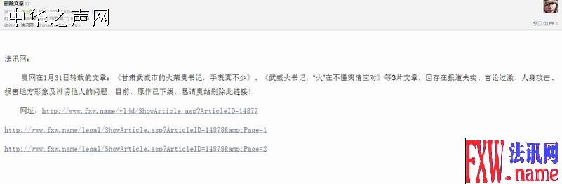 2016年1月31日,法讯网转载了法律人士郝劲松微博文章《甘肃武威市的火荣贵书记,手表真不少》5月17日收到QQ:3011503058信息称“因存在报道失实、言论过激、人身攻击、损害地方形象及诽谤他人的问题,目前,原作已下线,恳请贵站删除此链接!”法讯君看该文主要就是图片,而没有失实、攻击等行为,故不予删除。 而后法讯网公众号(fxw-name)发布的该文被删除,不说明身份的电话18909359956也多次打进。一篇仅4张照片的文章为何引起甘肃武威此人的重视,有何问题?法讯君便搜索发现火荣贵多张公开场合的戴表照,现发出以示读者,不做任何评论,网友自行甑别。