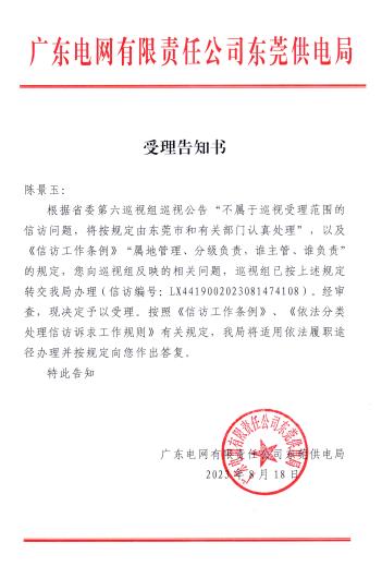 广东观音山国家森林公园向中共广东省委第六巡视组致函投诉近日有了回复:广东电网东莞市供电局给予了《受理告知书》。 东莞市供电局《受理告知书》 广东观音山国家森林公园向中共广东省委第六巡视组致函内容如下。 南方电网对东莞民企的伤害有多深?社会影响有多坏? 中共广东省委第六巡视组: 因你们带着党和政府的嘱托,带着党和政府对全国各地民企的关怀来到广东省,和你们的距离越近,越发觉得广东观音山国家森林公园需要你们的帮助,请你们倾听一下一个东莞旅游民企在23年的发展过程中,遭受了多少南方电网的肆意打击报复而导致的艰辛的发展历程。 23年来,观音山景区内的用电,竟然有80%是靠自己发电解决。观音山曾多次向东莞市供电局和供电公司申请市政供电,但都没有得到解决。迄今,广东观音山国家森林公园内仍然有约80%的区域是自购发电机和柴油进行供电,费用支出巨大不说,还涉及对游客的安全隐患等各种问题。 特在此将事情前后整理汇报给你们,请你们给予最公正的裁决,希望今后能让东莞民企广东观音山国家森林公园也沐浴到党和国家的关怀,尽快回到正常合理的发展轨道。同时,也让更多的东莞民企更踏实的经营发展,为东莞营商环境彻底改变,为东莞招商引资和经济发展助力。 一、背景介绍 广东观音山,一个被国家林业和草原局称为“生态样本”的国家级森林公园,也是全国首家民营国家级森林公园,一个被全国旅游景区质量等级评定委员会评为国家4A级旅游景区,唯一被授予“中国楹联文化名山”的荣誉称号,被誉为“南天灵秀胜境,森林康养福地”,曾获“国际生态安全旅游示范基地”、“广东人最喜爱的旅游目的地”、 “粤港澳大湾区年度最佳生态旅游企业”、“东莞城市绿肺”等数项殊荣桂冠,2019年游客接待量更是达150万人次。 据东莞市人民政府网站:首页>政务公开>公共企事业单位信息公开>供水、供电、供气页面显示,东莞供电局作为南方电网广东电网公司下属的特大型供电企业,始终践行“人民电业为人民”的企业宗旨,负责东莞区域内的电网建设运营和用电服务工作,供电面积2460平方公里,供电客户约299万户。 遗憾和奇葩的现实是:东莞供电局这299万户客户中,对“广东观音山国家森林公园”居然是区别对待的。 迄今为止,东莞市输电线路只进入公园约600米左右,仅有山脚下的门楼至慈云阁办公楼大概就是三四百米这个区域才有基本电力保障,其余占地超80%的大部分旅游景点区域包括山顶观音广场,一直以来都没有市政电力供应。特别是观音广场作为公园的核心景点,无论严寒酷暑每天都有百余名工作人员在无电的岗位上为成千上万的游客服务。观音寺僧众们也同样过着白天无电、晚上漆黑的生活。 东莞市供电局仅提供观音山国家森林公园约20%的市政供电,其他约80%供电是公园自己用柴油发电机解决,这23年来公园自筹资金购买发电设备、柴油,维护维修设备,聘请专业技术人员发电,每月要用高于市政供电3至4倍的能源成本给公园近80%的区域自主供电,发电房因为被迫选址在林区的核心地带,有较大安全隐患。 公园自主发电机房 ![]() 公园自主发电油库 “公园开办了23年,就用柴油机发了23年的电,每月大约要消耗6000升至9000升柴油,这种情况可以说是在全国都非常罕见的!” 23年来,因需要发电机发电,观音山公园已累计投资超过1500万元。特别困惑的是,因为电力不足,电力保障脆弱的现状,一直制约着公园的正常发展。 从2003年开始,南方电网旗下广东电网公司东莞市供电公司在未经观音山方同意,未向公园方提供国家林业、国土资源和环境保护等部门关于同意在公园内架设高压线塔的批复文件,审批手续不齐全的情况下,就多次毁林施工,将多组高压线塔强行违法架设在观音山国家级森林公园内,从而大面积破坏了公园核心地段的森林,严重影响了公园协调一致的整体规划。而原因居然是当时的供电局负责人违反工程施工承包须招标的规定,私下签订《施工承包合同》,不申办相关的报批手续,进而违规施工,中饱私囊而造成了如今的既成事实。 前来登山的游客很容易看到,有7组高压线塔均穿行架设在公园主要游客通道上空,密密麻麻,且未按要求升高架设。 而景区唯一的上山通道吉祥路的路基较高处,高压线距离地面仅为4米多,打雷下雨天,极其容易发生山火等安全事故,异常危险。 二、过程纪实 从时间点上看,1999年11月,黄淦波从东莞市樟木头镇石新村民委员会(后改为“石新社区居民委员会”)的手中接盘观音山森林公园,正式签署了50年的承包经营合同,开始将公园的发展引上正轨。 然而,自2002年开始,广东电网东莞供电局却在未经观音山公园同意,也未得到国家林业、国土资源等部门勘测同意的情况下,就擅自在公园内架设高压线塔,在此过程中,大量林木被破坏。这种行为使观音山公园的生态环境遭到破坏,旅游景观价值降低,同时带来巨大的安全隐患。 截至2012年,已有七组高压线路,十余座高压线塔穿行架设在观音山景区内,它们分别是:220千伏东莆甲乙线,110千伏古塘线,110千伏古清线,110千伏古裕线,110千伏古樟乙线,110千伏鹿窝输变电配套线路,220千伏东莞—角布双回送电线路工程;其建设时间分别为:2002、2004、2005、2006、2007和2012年,具体时间是在2014年前陆续建成。 在这七组高压线中,除一组是在公