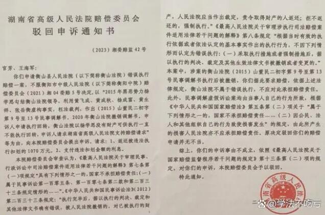 法官与多人勾结造虚假诉讼案获刑 被害人申请国家赔偿被拒 一个已经被裁定为虚假诉讼的案件,两个被认定枉法裁判的法官已判决入刑(法院领导刘志强被判8年有期徒刑,法官王再新被判6.5年有期徒刑),多个被认定参与制造虚假诉讼案的当事人已追究刑事责任的情况下,被害人反而陷入申无可申,赔无可赔的境地,在全面依法治国的大环境下,不禁令人扼腕叹息。案情清晰,责任认定明确,枉法裁判的法官已被刑事处罚。然而,因法官枉法裁判遭受巨大损失的被害人申请国家赔偿过程中,却层层遇阻,处处遭拒,被害人怎么也想不明白。 ![]() 湖南高院驳回申诉通知书 事情的经过是这样的。 2014年9月期间,莱阳建通房地产开发公司(以下简称:建通公司)房产开发出现资金缺口,股东罗某带着虚假诉讼案策划人杨某思及律师等一行7人到山东莱阳,说可提供资金拆借。经商定,杨某思同意借款1000万元,使用一个月,利息7分,利息先期扣除,到期还清。建通公司到期还清杨某思借款后,由于资金仍有缺口,又向杨某思借第二笔款项,约定期限为三个月,期满未能履约。杨某思即派律师到莱阳把建通公司的印章、证照及对公账户网银一并拿走。两个月后建通公司还清本金和利息,索要被律师扣押走的印章及网银U盾时,杨某思拒不归还。 两个月后,建通公司股东罗某带被害人王海军(建通公司法定代表人)去澳门赌场,罗某向杨某思拿筹码,杨某思强迫王海军在借条上签字担保。杨某思据此“担保”多次派人去建通公司讨要,由于被害人王海军没有实际借款,拒绝该要求。杨某思遂勾结户籍地衡山县人民法院(以下简称:衡山法院)领导刘志强和法官王再新,并教唆黄某秋等5人谋划虚假诉讼将被害人王海军、罗新、官芳、建通公司和莱阳万融房地产公司等个人及公司诉到衡山法院。开庭时,被害人王海军拒不认同该笔债务。庭审结束后,杨某思便将被害人王海军带至宾馆强行让其在事先准备好的《和解协议书》上签字。 衡山法院(2015)山宣民二初字9-13号调解书 衡山法院据杨某思单方面提供的《和解协议书》,违背双方当事人当庭签字的原则,出具了《(2015)山宣民二初字9-13号调解书》,“调解”被害人王海军、罗新、官芳、建通公司和莱阳万融房地产公司给付黄某秋等5人1000万元。“调解”生效后,杨某思申请执行,衡山法院采取对罗新拘留和冻结其他被害人账户等措施,强制扣划被害人官芳及建通公司账户1070万元。被害人王海军不服,以欠款系伪造,《和解协议书》是被逼迫下在宾馆签字,不是自己真实意思体现。于是向衡阳市检察院申请检察监督。 衡阳市检察院立案后发现,衡山法院副院级领导刘志强、法官王再新与杨某思勾结(三人均已判刑)设计虚假诉讼,存在枉法裁判。衡山县检察院以《山检(行)违监(2018)43042400001-5号再审检察建议书》提起检察建议。衡山县人民检察院检察建议指出:1、衡山法院违法受理财产保全申请,财产保全申请人主体资格不适格,且违反财产保全管辖的规定;2、衡山法院违法受理原审原告黄某秋等的民间借贷纠纷案,该院没有管辖权,且原审原告委托诉讼代理人何宏得的代理资格、代理手续及原审被告委托诉讼代理人王海军的代理资格、代理手续不符合法律规定,不能作为本案诉讼代理人;3、衡山法院《(2015)山萱民二初字第9—13号民事调解书》程序、内容违法,民事调解书不具有法律效力,具体是送达诉讼文书不符合法律规定,调解书事实不清,内容模糊;4、本案原审原、被告双方的债权债务关系不存在,系虚构。 ![]() 衡南法院结案通知书 衡山县检察院作出检察建议两年后的2020年3月30日,衡山法院才作出(2020)湘0423民监1-5号民事裁定书,撤销《(2015)山萱民二初字第9-13号民事调解书》,另行组成合议庭再审。 近9个月后的2020年12月20日,衡山法院作出《(2020)湘0423民再2-5号民事裁定书》。一、撤销《(2015)山萱民二初字第9-13号民事调解书》;二、驳回原审原告黄某秋、黄某飞、黄某祥、杨某富、张某衡五人的起诉。 事情到这里并没有结束。 “期待已久的再审裁定下来后,我的家庭和公司早已是物是人非。由于财产被查封,资金被划扣,执行回转又不能,只得向衡山法院申请国家赔偿。衡山法院亮出不存在的理由予以拒绝,上诉到衡阳市中级人民法院,以同样的说辞给予否定,再申请到湖南省高级人民法院,同样以衡山法院不予赔偿的词调认定不给赔偿。8年来,我们一家一直走在诉讼和信访的路上。从一个富裕、幸福之家到负债累累、居无定所、家徒四壁的家室,这期间仅仅是法官的一纸枉法裁判。现在法院却认责不认赔,我们作为普通老百姓一点办法都没有。如此冤屈,就是叫天天不应,叫地地不灵啊。”被害人官芳表示很无奈。 法学家刘鑫昌认为,人民法院是国家公器,行使的是国家意志,代表的是公平和正义。个别法官的枉法裁判给被害人带来巨大财产损失,或给被害人限制了人身自由,这不能把责任完全推给枉法裁判的法官本人。虽然枉法裁判是法官本人的意志,但他行使的是一种法官职务权力,代表的是国家意志。法官的枉法裁判造成被害人利益损失或使人身失去自由,法官虽然应该追责、担罪,但不能撇清人民法院在法官行使裁判、裁定和执行权力环节中枉法造成后果的责任。不能让无辜的人追偿不能,否则,法律的公平正义就无法彰显。 ![]() 衡南法院结