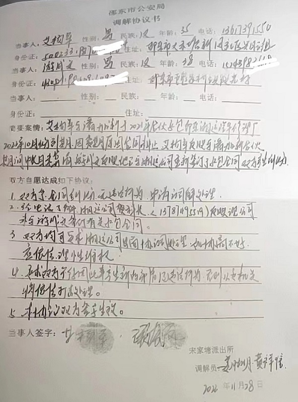 | 湖南邵东艾杨军:合伙人将我撵出汽修厂不算账也不退还我的十万元投资款,我该怎么办 独立撰稿人 李海波 年初本网曝光了三峡移民徐康被邵阳富商殴打强占耕地葬母事件,近日,又有在湖南邵东的三峡移民艾杨军向撰稿人投诉,称他投资十万元和人合伙成立汽修厂,合伙人不算账就将他撵出汽修厂后也不退款,法院另判他支付汽修厂材料款...... 老师傅投资十万合伙办汽车修理厂 大笔修车款被占用 为建设三峡发电站本着舍小家为大家的原则,1987年出生的艾杨军2004年随家入人由重庆忠州石宝寨迁入湖南省邵东市新风村。 2021年原老板游金志给艾杨军介绍了他的堂兄弟的舅佬潘加新合伙承包邵东西站湘运汽修厂,艾杨军和2000年出生的潘加新经口头协商约定合伙承包经营邵东汽车西站修理厂,由双方各出资10万元,各占50%的份额,艾杨军主管修理(艾杨军负责修大车,潘加新负责修小车),资金由潘加新掌管。艾杨军月工资5000元。艾杨军将出资款以现金81000元及工具、配件折价19000元交付给潘加新。10月19日由潘加新与湖南邵阳湘运集团有限责任公司邵东分公司签订《西站修理厂承包合同》,该承包合同约定承包期限壹年,从2021年10月19日起至2022年10月20日止,承包金为14.6万元。 ![]() 会计在潘加新建的工作群里发出的双方投资及支出结余情况 后来一个师傅给了1万的租金在修理厂补胎打黄油。这样汽修厂共有4.5万元的结余流动资金。 合伙后艾杨军以修理工的身份在修理厂工作。 进入修理行业10多年本着吃苦耐劳的精神让修理厂生意逐步稳定。但在2022年6月后,潘加新掌握修理厂资金既不算账,也不分红,仅支付艾杨军二个月工资,艾杨军多次向潘加新协商,均无着落。 ![]() 汽修厂的银行卡在艾杨军手里面,密码在潘加新手里面,两人约定钱只有两个人可以取出 由于疫情原因艾杨军在家无法到修理厂里面,某部队有一笔九万多的修理费打到了银行卡里。潘加新没有按照规矩和艾杨军商量就私自以法人身份重新办卡取出私吞。 艾杨军一直找潘加新算账,他却一直以各种理由推脱,由于潘加新是湘运汽修厂法人,湘运公司每月上万修理费打他银行卡里面,艾杨军也毫无办法。 ![]() 车站里面出的证明,并盖了公章交到法院。这样又看出来潘加新又私吞了17万多元合伙收入。 ![]() 单就这二家单位,就有近27万元汽修款被潘加新占用。这二家单位基本上都是大车修理,都是艾杨军和另外黄姓、曾姓二个师傅修理。艾杨军还预付了工资。 要求算账被合伙人赶出汽修厂 派出所调解无果 到了2022年8月,临近一年了,艾杨军将自己经手的账务微信发给潘加新,潘还在不懂的地方做了标记,并回复了艾杨军。 然而潘加新却不将自己经手的账务拿出来,不愿意算账。 ![]() 无奈之下,艾杨军找到车站领导求助。 2022年10月15日,机务科李承志科长出面调解无果。10月20日,车站赵经理告诉艾杨军说潘加新已经交了五万保证金并说潘加新背后有人操作。 10月21日,艾杨军和潘加新谈话无意说了实话,潘加新告诉艾开修理厂他本人没有钱,是他姐夫游成文、潘菊香两夫妇出的钱。如果生意好了,就把两人账目算清楚,把艾赶走。 10月23日,艾杨军查库房配件和开出的发票发现潘加新把他姐夫游成文和人家合伙的10多台邵东到长沙的定制专线修理费,只开票三台,还有多台没有开票。当时是新车首保配件加工时是1300一台。 11月19日,艾杨军到车站办公室找赵经理和李科长他们了解情况。车站领导约到游成文,当时游成文当着车站领导的面明确的说,合伙是不可能的事情。艾杨军当时当着车站领导和游成文的面说如果不愿意和我合伙,希望把账目算清,不希望走得不清不楚。游成文当着车站领导的面说他不怕艾杨军闹事,让艾想怎么办就怎么办? 11月25日,部队相关领导打电话给艾杨军,修理厂的修理费先下来六万多,但是当时艾已经被潘加新赶走,银行卡被潘以法人名义冻结,艾杨军无奈把卡号发给了赵经理希望他们重视。 ![]() 11月28日,艾杨军等到疫情过后到修理厂里面,潘加新和姐夫游成文把艾的私人东西从修理厂二楼扔出,并告诉艾合伙已经到期,可以把艾赶走了。就这样修理厂在没有算账情况下被潘加新占为己有。修理厂库房有一万多元配件,和共有资产也被他占为己有。艾杨军无奈打110到派出所里面,之后艾杨军和游成文被带到百富广场的派出所里。游成文仍然说修理厂是他游成文的,后经过车站相关领导证实游成文说假话,车站修理厂不可能包给他。派出所要求算账并出了相关口供,并签字按手印,要求算账。 ![]() 派出所调解协议书 12月7日,艾杨军打电话给李承志科长,当时李科长明确告诉艾,部队银行卡里面的修理费,如果两人账目没有搞清楚,哪个都拿不了这个修理费。并说潘加新愿意马上和艾算账。 2023年1月3日,艾杨军约到车站领导李承志科长和车站相关领导,他们出的方案是如果两人算不清楚,就请专业会计,当时潘加新和艾杨军都同意。 2月28日,车站领导贺文平,李承志相关领导,把艾杨军和潘加新约到车站派出所,潘加新干脆以账本丢失为由不愿意算账。 2月6日,艾杨军打电话给车站领导申所长。对方说潘加新以账本丢失为由不算账他也没有办法,让艾打官司。 艾杨军无奈找到大禾塘办事处,办事处让他去找信访局。到信访局听了艾的录音和相关资料,就让艾打官司。 起诉法院却败诉 还被诉