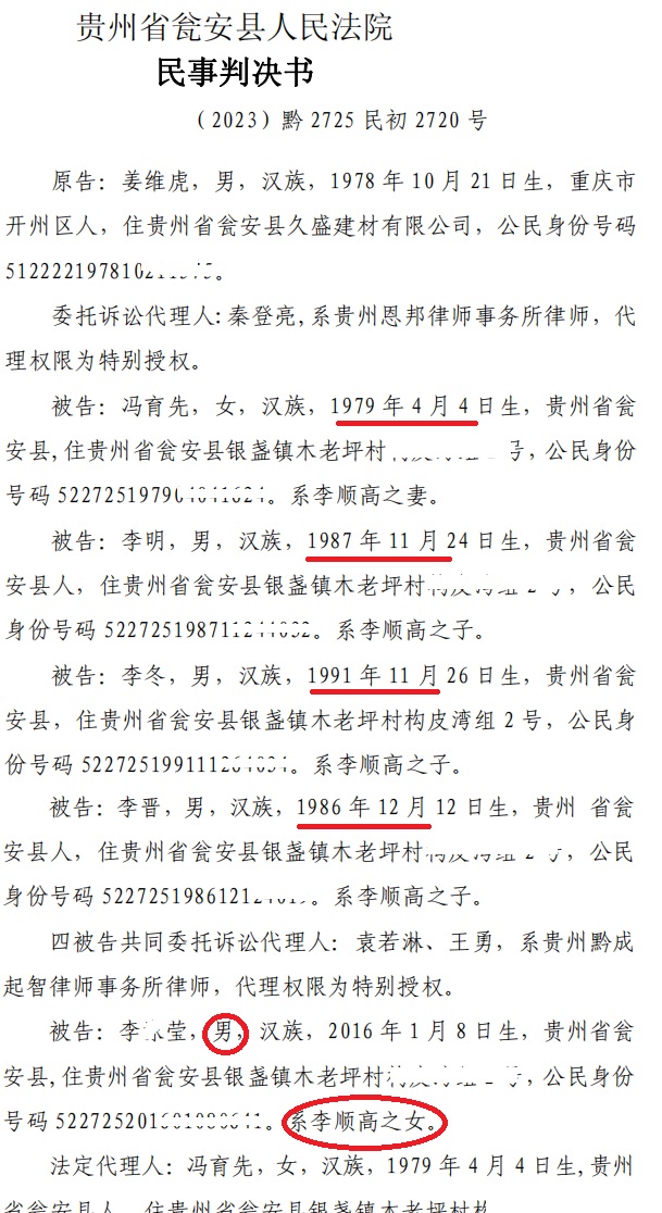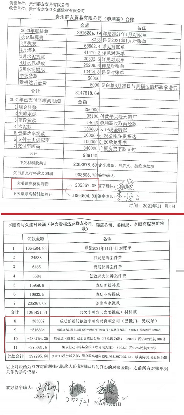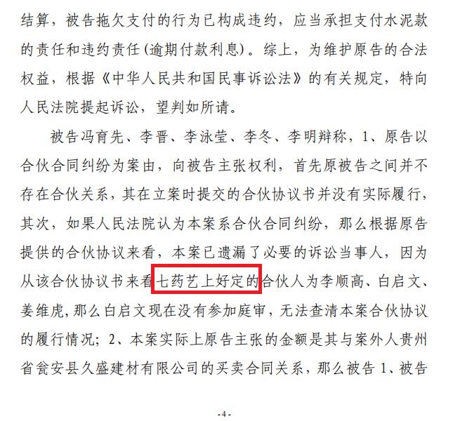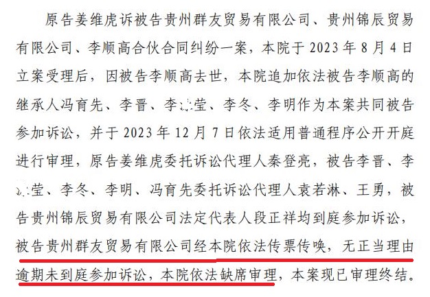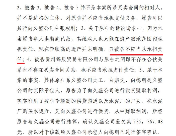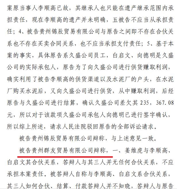 | 奇!贵州一法院竟以未达到支付条件驳回原告起诉 独立撰稿人 李海波 驳回诉讼请求的情形主要包括:原告的诉讼请求没有法律依据;原告错误地主张法律关系,即提出的诉讼请求与案件事实是两个不同性质的法律关系;原告超过诉讼时效提起诉讼;原告自身缺乏诉讼权利能力和行为能力;原告不是与本案有直接利害关系的当事人;没有明确的被告,即原告诉称的承担民事责任、履行民事义务的对象必须是具体的某个或几个公民、法人或其他组织;没有具体的诉讼请求和事实理由;属于人民法院受理民事诉讼范围和受诉人民法院管辖的事项,但不属于人民法院主管工作的范围。 而贵州省瓮安县人民法院(2023)黔2725民初2720号民事判决书却颠覆了这些情形,它增加了驳回诉讼请求的一项理由:未达到支付条件! ![]() 而这份判决书,撰稿人发现明显的错误有几处:一是被告李某莹注明男性后面载明却是死者之女! ![]() 二是这里面的“七药艺上好定的”是什么意思? 三是被告贵州群友贸易有限公司经本院依法传票传唤,无正当理由逾期未到庭参加诉讼,判决书又提及“被告贵州群友贸易有限公司辩称,一、姜维虎与李顺高、 白启文其合伙关系,答辩人与其三人并无任何合伙关系,不应承担本案责任……”没到庭参加诉讼的群友公司是如何进行辩称的呢?让人一头雾水! ![]() 五是李顺高明明有5继承人,后面怎么又是四继承人了?瓮安县法院连12345都数不清了? 签订合伙协议 为二公司供应水泥 2020年9月15日,重庆市开州区人姜维虎与贵州省瓮安县银盏镇的李顺高、瓮安县退休法官白启文在前期达成合伙意向的 基础上签订了书面合伙人协议书,约定三人合伙投资为贵州省瓮安县久盛建材有限公司及贵州誉福隆科技有限公司提供水泥,以被告李顺高名义对外开展业务并具体负责管理决策。 姜维虎、李顺高、李昌菊签订了《合伙人协议书》如下:“合伙投资人就合伙投资为瓮安县久盛建材有限公司及贵州誉福隆科技有限公司提供水泥达成如下协议。一、合伙投资人及股份比例:李顺高33.33%,白启文33.33%,姜维虎33.33%。各股东根据股份比例以现金方式筹资(以实际到指定帐户资金为准)。二、合伙项目的管理:1、合伙资金由向德明进行管理并负责会计记帐工作,全体合伙人对帐目进行监管,专款专用,严禁挪用,资金进出需经三人以上签字认可。李昌菊任职出纳,合伙指定专用帐户为李顺高的贵州农信帐号:6217790001159338***。2、合伙投资业务由股东共同商量,由李顺高负责管理,具有决策权。3、每月与久盛建材有限公司对帐后进行财务公开。4、每季度进行一次利润分红。三、其他合作事宜:1、合伙投资人向合伙投资人以外的人转让其在合伙投资中的全部或部分出资额时,须经其他合伙投资人同意。2、合伙投资人按其出资额占出资总额及投入资金的时间的比例分享共同投资的利润,分担共同投资的亏损。3、合伙投资人按其出资比例共同承担风险责任。4、合伙人不得在合伙不利时退股。5、如因公司原因导致本合作终止,则必须结算清楚并支付完成后方可允许第二家单位供货。四、违约责任:1、由于合伙人单方行为造成的损失,由责任人赔偿。2、合伙人一方违反本协议,给另一方造成损失的,违约方应承担赔偿责任。 五、其他:1、本协议未尽事宜由合伙投资人协商一致后,另行签订补充协议。2、本协议签字盖章后即生效。本协议一式叁份,合伙投资人各执一份。3、投资双方若发生纠纷,协商不成的,任何一方有权向人民法院提起诉讼或瓮安仲裁委员会仲裁。” 之后姜维虎向合伙指定专用账户李顺高银行卡共计打款20万元,分别于2020年9月3日打款15万元、2020年10月26日打款5万元。 2021年10月28日 ,法定代表人为冯育先的贵州鸿育顺商贸有限公司(甲方)与贵州省瓮安县久盛建材有限公司(乙方)签订了《债权转让协议书》:因甲方向乙方供应建材,乙方现需支付甲方货款 516834元,又因方向贵州省创致远大建设工程有限公司供应混凝土等建材在贵州省创致远大建设工程有限公司处享有债权(具体金额不清,但乙方向甲方承诺其在贵州省创致远大建设工程有限公司享有的债权金额大于516834元。)乙方自愿将其对贵州省创致远大建设工程有限公司享有的债权中的516834元转让给甲方,本协议签订后由贵州省创致远大建设工程有限公司与甲方补签《混泥土购销合同》并由贵州省创致远大建设工程有限公司出具金额为516834元的《创致远大建设工程有限公司-朵云安置E地块对账函》给甲方作为债权凭证。由甲方自行从贵州省创致远大建设工程有限公司处收取货款516834元。 2021年11月4日,合伙人对水泥款项进行了第一次结算。明确载明“欠姜维虎材料利润235367.08”。 2022年7月21日,双方在第一次结算的基础上再次对水泥款项进行确认和结算,向德明、李顺高、姜维虎签订了《李顺高与久盛对账涵(包含贵福达及群友公司、锦辰公司、姜维虎、李顺高煤灰矿粉款)》:经结算贵州省瓮安县久盛建材有限公司共差欠水泥款1361421.31元,其中姜维虎的为235367.08元。 其中8-11项说明:8.成功矿粉转抵给李顺高的冯育顺公司(已抵扣383037元,见收条);9.创致远大混凝土款转抵给冯育顺公司516834元(以兑现为准)(2022)黔 2725民初915号;10.贵福达(群友)已起诉冻结金额483764.35元(以兑现为准)(2022)黔 2702民初106号;11.锦辰已起诉冻结金额3750