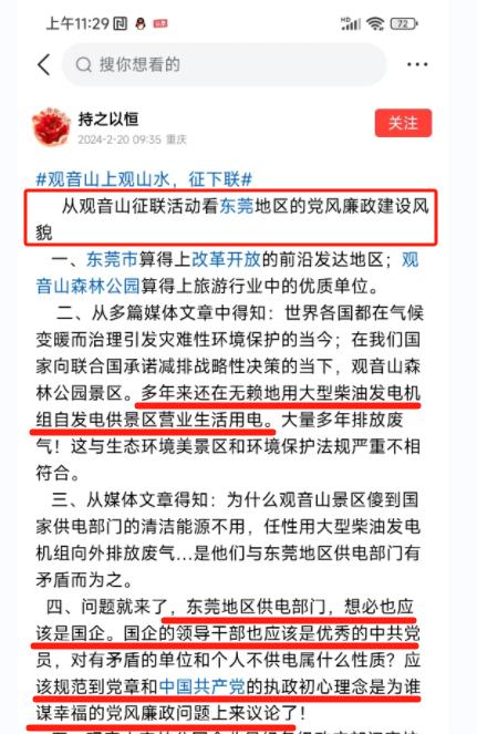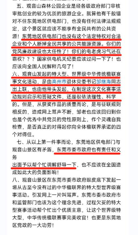 从“观音山上观山水”征联活动看东莞地方政府的党风廉政建设风貌![]() 洋溢着喜庆祥和气氛的观音山公园城门楼 甲辰龙年新春伊始,岭南大地春意盎然、草木吐秀。网络上一则“从观音山征联活动看东莞地区的党风廉政建设风貌”的帖子,引发了广大网友的关注与热议。该热心网友针对观音山景区的征联动活、供电受限、环境保护问题等对东莞地方政府的廉政建设发出灵魂拷问,并表达了自己的观点和看法。 据了解,广东观音山国家森林公园(以下简称“观音山公园”)位于东莞市樟木头镇,是我国首家民营国家级森林公园。从一座名不见经传的荒山,发展为集森林氧吧、文化体验、姻缘许愿于一体的国家AAAA级旅游风景区。观音山公园每年接待游客超百万,已成为粤港澳大湾区知名的网红打卡地。 观音山公园管理人表示,观音山公园原为樟木头镇石新村村集体林场,1999年11月30日,东莞市民营企业家黄淦波与樟木头镇石新村村委签订50年承包合同。2000年12月21日经东莞市人民政府“东府办复【2000】458号”文件批准,成立东莞市观音山森林公园,占地面积26178亩(含石新社区、金河社区、官仓社区、樟洋社区)。为便于管理注册成立“东莞市观音山森林公园开发有限公司”(以下简称“观音山公司”)作为主体管理经营。2005年12月,观音山公园经原国家林业局批准正式命名为“广东观音山国家森林公园”。2007年7月30日观音山公园总体规划获广东省林业局批准执行。 24年来,观音山公园一直致力于对森林资源和生态环境保护事业,取得了显著的成绩。2007年原国家林业局发文称赞观音山为“全国的一个样本”。2019年《人民政协报》公开发文称赞观音山为“两山理论”实践的鲜活样本。2021年《人民日报》和《光明日报》分别发文称赞公园所取得的成绩,成为了全国发展森林文化旅游事业的成功典范。2022年、2023年曾被央视《新闻联播》等节目报道表扬,并对观音山公园取得的成绩给予极大的肯定。 24年来,观音山公园生态环境遭受了巨大破坏,园内违建的别墅、豪华坟墓、饭庄、工厂、会所、住宅计90余处,被毁林近2000亩,观音山公园为保护好国家宝贵的森林资源,保护好大湾区这片生态环境样本,不畏打击报复,多年来不断向有关部门反映但都未得到有效解决。 为了探讨“观音山现象”对于全国民营企业的借鉴价值,以及对于地方政府改善营商环境的启示意义。2023年12月24日,北京举办第六届民营企业研讨会,专家研讨“观音山现象”与“东莞门”事件。 那么,什么是“观音山现象”? “观音山现象”是指广东观音山国家森林公园遭遇的境况,一方面,公园24年来快速发展,现在观音山公园不仅是著名的自然景点,也是世界闻名的文化景观;另一方面,因为观音山公园是一个民营的国家级森林公园,遭遇到很多的现实困境,而这些困境,是当地党政部门的主要官员违法违规强加在观音山公园的。 什么又是“东莞门”事件? “东莞门”事件指东莞少数腐败官员(如前市委书记刘志庚,已被判刑)对于民营的观音山国家森林公园,从最开始的索贿不成、强要大量干股不成,开始打击报复到后来的抢夺经营权失败,再到后来的不作为,历时二十多年,个别官员完全躺平,导致观音山国家森林公园因为规划修编不成而很可能被摘掉“国家森林公园”的牌子等等的恶果,这就是“东莞门”事件。 据观音山公园相关负责人反映,公园建园至今24年,仍未全面获得市政电力供应,以致每月要用高于市政供电3至4倍的能源成本自行给公园近80%的服务区域供电。虽然期间一直通过写反映信、向法院起诉等多种方式维权,但均未推动问题解决。 近年来,特别是今年以来,包括人民网、环球网、澎湃新闻、中国商报、证券时报等在内的多家主流媒体均对观音山公园遇到的困难予以高度关注。社交媒体上相关话题也屡上热搜,微博“东莞观音山事件”“广东观音山国家森林公园”“观音山上观山水”等话题阅读量均已经屡屡过亿。 ![]() 笔者实地探访观音山公园发现,从山脚下的观音山城门楼往上至慈云阁办公楼区域,属于东莞市政供电范围,但从慈云阁再往上至山顶观音广场区域,因未取得市政电力部门供电,公园只能自筹资金购买发电设备自主发电。 ![]() 山顶发电机房的三组发电机正在轰隆隆地工作中 ![]() 数组高压线和塔基耸立于公园内 观音山公园和东莞供电局的纠纷长达24年!因为拒绝大贪官前东莞市委书记刘志庚(2016年因受贿9817万元,被判无期)的强抢而受到长期打压,先是五条高压线违法在国家森林公园核心保护区架设,再是经常错峰限电,继而一直拒绝给观音山公园全面供电,致使公园目前有80%的服务区域没有市电供应。而在整个事件中,供电部门成为了刘志庚抢夺民营企业的打手并一直作恶至今。 从2002年开始,东莞供电局在未经公园方同意,在审批手续的不齐全的情况下,先后将多组高压线塔架设在观音山国家级森林公园内到2012年6月,东莞供电局依然在未取得相关主管部门的批文或同意、且没有公园方同意的情况下,在观音山森林公园范围内的山体及吉祥路两边,进行220千伏东莞至角布双回送电线工程及110千伏鹿窝输变电配套线路施工建设,毁林近百亩;再到如今2024年,仅仅一个民营企业的要解决80%区域的用电,前面就有这麽多的“拦路虎”。这不得不说是东莞的悲哀。 24年,何其漫