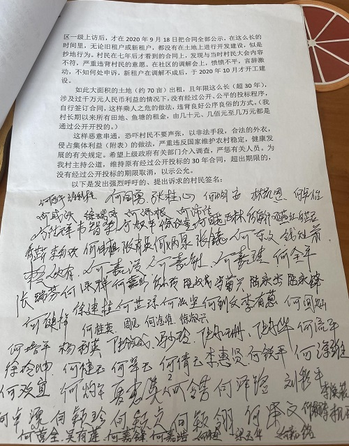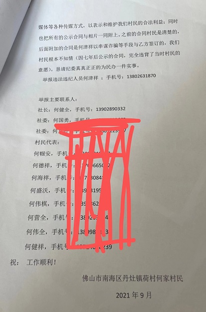 | 广东佛山南海区丹灶镇荷村民呼声之一:我村的征地补偿去哪了? 我们是佛山市丹灶镇荷村何家经济社村民,全村165人,老人34人,被现任荷村书记徐铨昌等“村霸”打压,把我村利益全部暗中输送社会老板,群众生活非常艰苦,紧急向上级领导和媒体求救,救救村民们吧。我村民现在是无权(公章被村书记非法掌控),无势(村路被安装了5支监控,24小时监控村民),无钱,真正是无奈! ! 2013年政府补偿何家村70亩工业开发指标,查证是荷村书记徐铨昌和原社长何津祥,私下签订巨额让利补充合同,把集体每年应收的约400万租金,秘密暗中输送给社会老板。群众从不知情,也没有召开村民大会同意,完全是私下操作。2020年,村民追问徐铨昌书记我村的土地返还指标,徐书记还哄骗我村民。 据信,丹灶镇党委书记何敏仪(女)明显包庇,对南海区委巡察组查出的徐铨昌七八宗违法事实,不但没有处分,反而更进一步推荐徐铨昌成为区人大代表,和南海区纪委书记面对面提建议。已经有证据涉嫌贪腐的村书记,却对着纪委书记侃侃而谈,岂不一大笑话?这是何敏仪公然不把群众放在眼里,也不把区委巡察正式结论放在眼里,暂时的权力已经让何敏仪这些保护伞,迷失了自我。 作为所辖七个经济合作社的村级书记,何家合作社起码百分之七十以上村民反对他,起码一半以上合作社明确反对徐铨昌,认为他当村书记“吃相难看,群众基础不是一般的差”。在这种干群严重对立的情况下,徐铨昌当村书记10多年,从开KTV负债累累,老婆无业,现在千万物业自家建人工泳池的奢靡,没有镇、区个别人当保护伞,侵吞我村每年起码300万元以上的“指标田”补偿,可能吗? 我村的公章,通过追查才发现,没有公布,没有开会程序,没有村民知情的。盖我社公章的合同二份,盖我社政府返还村开发的指标三份,法律规定《必须要召开村民大会和公示》却被暗箱操作,何家村集体经济损失千万。我村的公章,至今还被村书记管控,无法申请任何的盖章手续,被村书记只手遮天。 70亩“留用田”返还指标,隔壁南坊村和我村一起征收,一起返还指标,但人家己收每人每年3万/年。我村民追问徐书记我村的指标呢,徐书记回复医院看病都要排队,等下先。真此有此理,真被气死。村书记有意隐瞒“留用田”指标被批准事实,长达7年之久,合同也不允许村民看,很显然是使外村人低价租赁到国有建设用地,差价近10倍,现在这块地仍然暴利收租,村书记用暴力手段不允许我村民维权,哪怕是请人打官司也不允许,很明显有利益贪腐。我村民50多次向上级部门反映,也被打回“属地管理”,仍然落在徐书记手中。 被低价出租的“荷桂公路西”地块,2014年前是水田乡路等农业用地,2008年出租给个人用于建设门市房对外收益,违反《土地管理法》合同无效的行为。2014年徐书记和何津祥仍然转租给社会老板,直接篡改村民表决,送给老板千万利益。将千万我村收益私下签补充合同送给外乡人,没有贪腐和丰厚的利益,谁会不惜背叛朝夕相处的乡亲,被村里人指着鼻子骂? 上级政府救救我何家村民,不要再给年老体弱多病在身行动不便的老人,受35度高温的烈日下露天维权行动之苦了。再不追查责任人。再次出现烈日维权的场面,老人家身体必会迫出事故。徐铨昌任村书记,每年从何家经济社上缴管理费10多万元,(帐目不明)能为村民办事都值。10年来,未见书记给村民做过半件公心事,反而对何家村民忍瞒事实,滥用职权,打压老人,镇压村民,养狗咬家人。 2021年以来,我村民联名向南海区纪监委举报,村书记徐铨昌、何家前社长何津祥,隐瞒国有建设用地指标审批,低价使社会老板承租何家土地、私下签协议盖公章输送千万利益等违法事实,有20余次,合法信访30余次,由于有保护伞,4年多仍未有解决,请上级政府和媒体,救救我们村百姓吧! 下图:佛山市纪委监委明确要求整顿南海区土地租赁乱象,尤其是暗箱操作低价承租集体建设用地涉嫌贪腐。南海区阳奉阴违,对典型的何家经济社问题,故意包庇不整改,却对上级大表功德。 |
