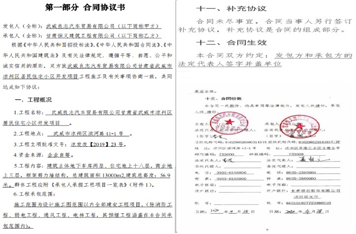 2020年4月28日,恒义公司和良志汽贸签订《建设工程施工合同》,武威良志汽车贸易有限公司甘肃省武威市凉州区居民住宅小区开发项目由甘肃恒义建筑工程有限公司施工,承包方式:包工包料。
