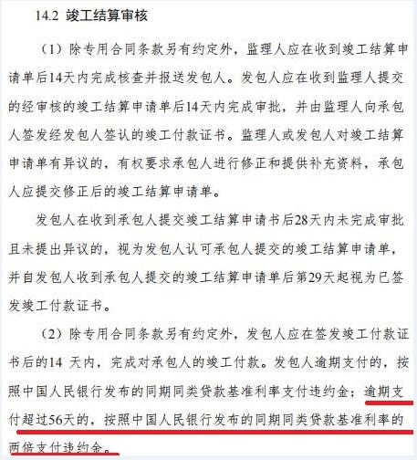竣工结算审核约定:发包人逾期支付的,按照中国人民银行发布的同期同类贷款基准利率支付违约金;逾期支付超过56天的,按照中国人民银行发布的同期同类贷款基准利率的两倍支付违约金。
