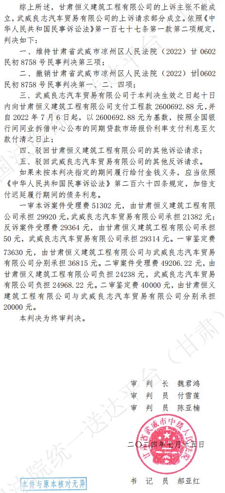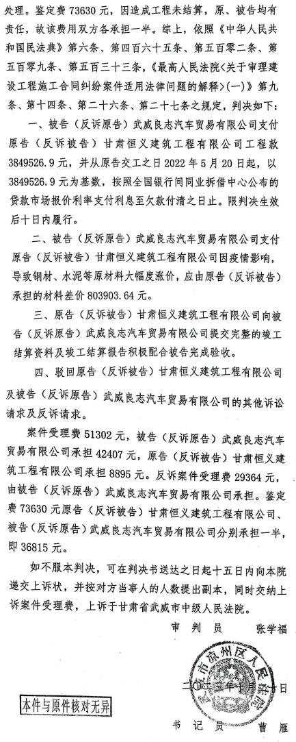 2023年10月20日,武威市凉州区人民法院下达的(2022)甘0602民初8758号民事判决书。 二审判决差强人意 承建方损失惨重临破产 恒义建司认为凉州法院没有按照合同约定事项判决,于是提起了上诉,请求“以3849526.9元为基数,按照全国银行间同业拆借中心公布的贷款市场报价利率支付利息至欠款付清之日止”判项,改判为以3849526.9元为基数,按照合同约定的利率(武威农商银行工程贷款利率的2倍)计算工程款利息至付清之日止。 而良志汽贸也同时上诉主张撤销原审判决,改判驳回恒义公司一审全部诉讼请求,支持良志公司一审反诉请求。