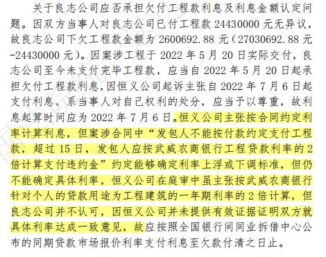 二审中,武威中院依法向武威农商银行市场发展部调取了关于建筑工程类贷款利率情况说明。 甘肃省武威市中级人民法院在2024年7月15日下达了(2023)甘06民终2242号民事判决书。 关于案涉工程材料差价的认定及承担问题。该判决书认为:根据案涉《建全国法院统一送达平台(甘肃)设工程施工合同》第一部分第四条签约合同价与合同价格形式第 2 项“本合同固定总价款为整个项目施工的包干价款,不因一方报价漏项或政府政策调整、市场变化、风险等因素而调整。除双方协商约定计算的费用外不再计取任何费用。”第三部分第11 条价格调整 11.1 第一款“市场价格波动是否调整合同价格的约定:不调整。”之约定,该合同约定固定价款,且排除了市场变化等引起的价款变化风险,表明双方当事人在签订该合同时,已对合同的风险进行了预知和判断,合同所约定的风险分配属于当事人意思自治范畴,理应予以尊重,恒义公司应当对因市场变化等引起的材料价格上涨风险承担责任。同时,在合同履行过程中,恒义公司未向良志公司提出原材料上涨需调整工程价款的请求,亦不能提供与施工形象进度对应的各施工期主要材料使用量确认资料,不能将原材料上涨的损失归责于良志公司。 武威中院认为,本案争议焦点为:1.恒义公司关于良志公司向其支付已完工程价款的主张应否予以支持,如支持,恒义公司完成工程价款金额如何认定;2.案涉工程材料差价应如何认定及承担;3.良志公司应否承担欠付工程款利息支付责任,如承担利息金额如何认定;4.恒义公司应否承担工程延期的违约责任。 关于良志公司应否向恒义公司支付已完工程价款及工程价款金额认定问题。第一,根据恒义公司一审出示的钥匙移交登记表,该登记表末尾有良志公司法定代表人李俊签字并加盖了公司印章,良志公司工作人员亦在接收人一栏进行了签字确认,能够证明良志公司于2022年5月20日接收了滨河路41-1号楼房钥匙,由此,可以认定良志公司已于2022年5月20 日即取得上述房屋的控制管理权,良志公司关于2022年5月20日交付的是工程钥匙、不涉及使用的上诉理由不能成立。结合当事人一审中提交的工程预验收材料、2022年9月19日监理公司向恒义公司发出的监理通知单可知,案涉房屋存在出售情形,也即良志公司在案涉工程预验收后即对房屋进行了出售,存在擅自使用情形,由此,自2022年5月20日,良志公司即应向恒义公司履行付款义务。 第二,恒义公司要求良志公司支付工程款且明确不再继续施工,良志公司在二审中亦申请对恒义公司未施工部分内容进行造价鉴定并要求在工程款中扣减,合同继续履行不具有可行性,而经查,恒义公司确实存在未施工情形,故为实质性解决案涉纠纷,结合双方签订的建设工程施工合同及案情实际,对恒义公司未施工内容,可扣减相应工程款。 第三,根据甘桐立工咨鉴字[2024]第006号工程造价鉴定意见书可知,原合同及补充协议未施工内容所对应的工程价款为536334.37元,恒义公司虽主张该项目中地下室地面混凝土地面扣减与采暖工程中钢丝网分项扣减不适当,但并未提供有效证据反驳鉴定意见,应当承担举证不能的不利后果,对原合同及补充协议未施工内容造价应当予以扣减;对工程联系单未施工内容造价148957.32元,因该鉴定意见所依据的四份工程联系单对应工程价款并未计入甘弘睿鉴定[2023]鉴字第014号工程造价鉴定意见书第六项变更签证联系单所对应价款中,故对工程联系单未施工内容造价不应予以扣减;对现场勘察勘验确认未施工内容造价58608.33元,恒义公司对建筑与装饰部分电梯井孔道未封堵部分的造价不认可,该部分项目所对应合价8544.26 元,因良志公司在合同签订前向恒义公司送达的预算编制须知第三部分不报价部分约定了地下室风机房、电梯井隔声墙,良志公司虽主张编制须知并非合同最终约定内容,但并未提供相应工程预算书等能够反驳预算编制须知的证据,应当承担举证不能的不利后果,故恒义公司关于不应扣减电梯井道孔洞未封堵项目价款的抗辩应予支持,确认扣减现场勘察勘验确认未施工内容价款 50064.07元(58608.33元-8544.26元);对单列的临时设施费造价,恒义公司虽主张其进行了其中的厕所、水电进入现场,但并未提供有效证据证明,应当承担举证不能的不利后果,甘肃桐立工程招标造价咨询有限公司将该部分费用 115341.24 元计入扣减项目中并无不当;对单列的住宅楼阳台厨房推拉门费用,根据良志公司向恒义公司送达的答疑回复第13条“室内门不计入报价”之答复内容,住宅楼阳台厨房推拉门不属案涉合同施工范围,故良志公司关于要求扣减该部分费用的上诉主张,不应予以支持;关于图纸与实际现场不符内容造价,一审中鉴定机构对恒义公司完成工程价款之认定包含22880000元建设工程施工合同全部价款和1250000元补充协议全部价款,但经甘肃桐立工程招标造价咨询有限公司评估鉴定,恒义公司实际完成合同内工程存在图纸与实际现场不符内容造价547094.34元,该部分系对变更减少内容的造价认定,因甘弘睿鉴定[2023]鉴字014号工程造价鉴定意见书及异议回复包含对变更增加内容的造价认定,故结合案涉建设工程施工合同及案情实际,理应扣减该部分减少造价。关于质保金,根据案涉合同第三部分12.4.1付款周期之约定内容,在工程竣工验收备案、双方当事人竣工决算签字盖章后,良志